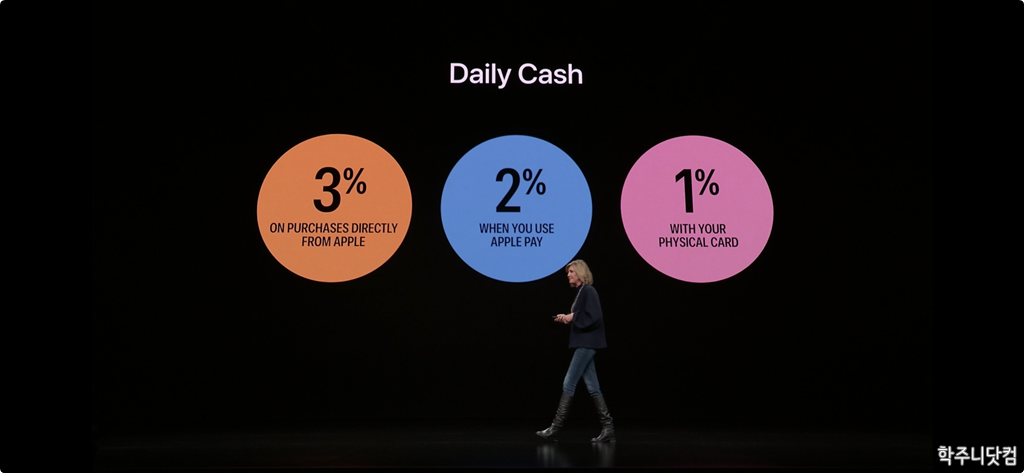 앞서 애플카드의 핵심 중 깔끔한 리워드 프로그램이 있었는데 다름아닌 데일리 캐시라는 프로그램이 그 리워드 프로그램이다. 실물 카드를 통해 결제를 하면 1%, 애플페이를 통해서 결제를 하면 2%, 애플스토어(온, 오프라인 포함인 듯)에서 애플 제품을 이것을 통해(실물 카드, 애플페이 포함인 듯) 결제를 하면 3%의 캐시를 준다는 것이다. 여기서 얘기하는 캐시는 애플 월렛 앱에 저장할 수 있는 캐시이며 애플페이나 애플카드를 통해서 사용할 수 있고 통장으로 이체도 가능하다고 한다. 일종의 캐시백 서비스다.