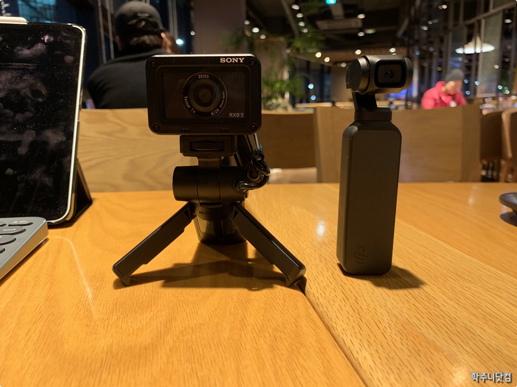 01오즈모 포켓과의 크기 비교 RX0 II의 크기가 얼마나 작은가를 제대로 확인하려면 오즈모 포켓과 나란히 세워보면 알 수 있다. RX0 II에 VGT-SGR1을 끼운 상태여야 오즈모 포켓과 높이가 비슷하다는 것을 알 수 있다. 그냥 RX0 II와 오즈모 포켓을 나란히 세우면 RX0 II가 훨씬 작다.