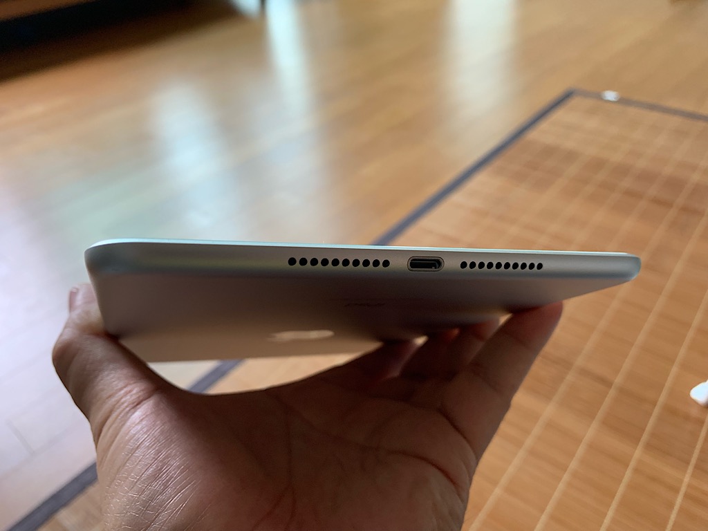 아이패드 미니 5의 밑 부분 미니 5는 앞서 언급했듯 미니 4에서 디자인적으로 변화가 거의 없다고 했다. 아니 아예 없다고 해도 무방할 정도다. 그 얘기인 즉, 연결 케이블 역시 프로 3에서 채택했던 USB-C 타입이 아닌 기존 아이폰이나 아이패드가 채택하고 있는 라이트닝 케이블 방식을 그대로 가져가고 있다. 만약 아이폰을 사용하고 있다면 라이트닝 케이블 하나로 갖고 있는 아이폰과 미니 5를 같이 사용할 수 있으니 이건 나쁘지는 않을 듯 싶다. 다만 프로 3이 채택한 USB-C 타입이 아니기 때문에 확장성에 있어서는 좀 아쉬울 듯 싶다. 향후 iPad OS의 정식 버전이 나오면 외부 스토리지나 디바이스와의 연결이 기존보다 자유로울 것으로 보이는데 그때 좀 많이 아쉽지 않을까 싶다.