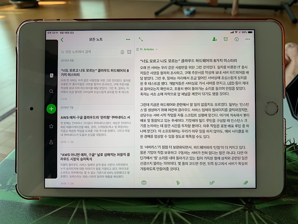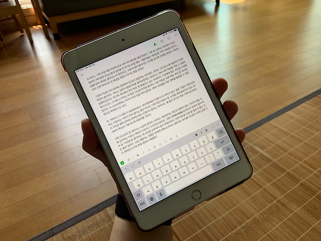 블루투스 키보드를 연결한 상태에서의 에버노트 편집 모습 하지만 블루투스 키보드와 같이 외부 키보드가 있다면 불편한 터치 키패드를 사용하지 않아도 된다. 내 경우 로지텍의 K380을 사용하는데 미니 5를 가로 모드로 거치해두고(이런 이유 때문에 스마트커버형 케이스를 산 것이다) K380으로 입력을 한다. 이러면 PC에서 에버노트를 사용하는 것과 별반 다를 것이 없다. 물론 마우스를 이용하여 움직이는 것이 안되고(iPad OS에서는 어느정도 가능하지만 이 글을 쓰는 시점에서 미니 5의 OS는 iOS12.4이다) 터치로 움직여야 한다는 아쉬움이 있지만 K380에 있는 방향키를 이용하여 어느정도 움직이면서 작업을 하면 훨씬 편하게 노트를 만들거나 기존 노트의 내용을 수정할 수 있다. 그런데 내 경우에는 프로 3 12.9인치 모델을 갖고 있기 때문에 편집 작업은 어지간하면 프로 3에서 진행하고 미니 5는 앞서 언급한 것처럼 이미 만들어진 노트를 열람하는 정도로 사용한다. 물론 이동하면서 수정이 필요로 할 때에는 세로 모드로 편집을 살짝 하기도 하고 말이다.