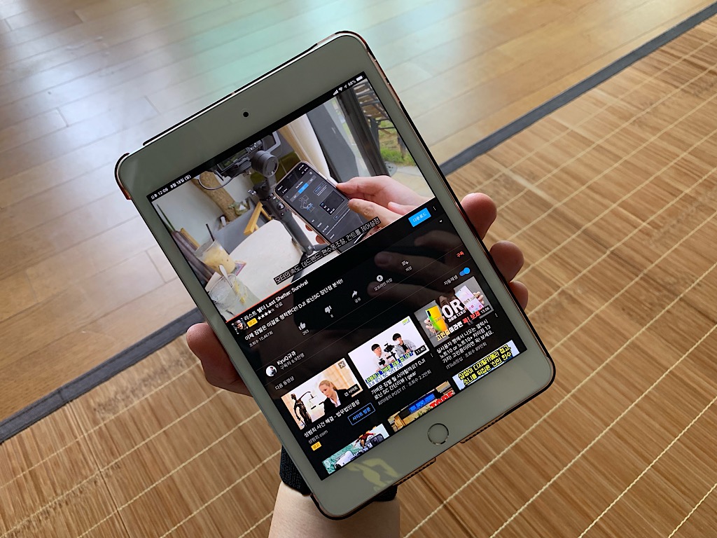 전체 화면으로 유튜브를 볼 때의 모습 앞서 언급했듯 미니 5의 4:3 디스플레이 비율은 동영상을 시청하는데 있어서 무척이나 아쉬운 비율이다. 위의 사진은 유튜브 영상을 전체 화면으로 봤을 때의 모습인데 영상이 16:9나 16:10 비율의 영상이라면 위의 사진과 같이 위, 아래로 어느 정도 검은색 레터 박스가 생기게 된다. 16:9 비율의 안드로이드 태블릿이었다면 아마도 레터 박스 없이 화면에 꽉차게 영상을 시청할 수 있었을텐데 미니 5는 그 부분이 아쉽다. 물론 이건 미니 5 뿐만이 아니라 현재까지 나온 모든 아이패드 시리즈(미니, 프로, 일반 시리즈를 통틀어)가 다 해당되는 것이니 미니 5만의 문제라고 보기는 어렵다.