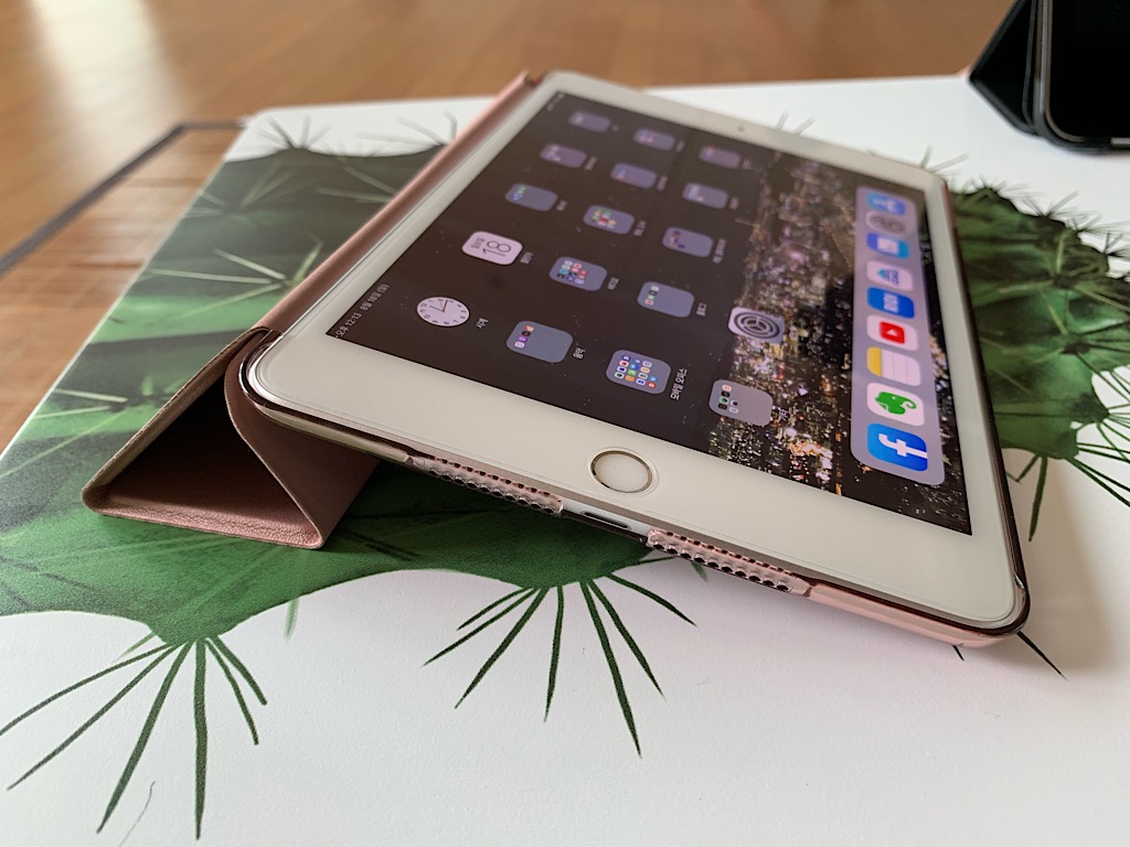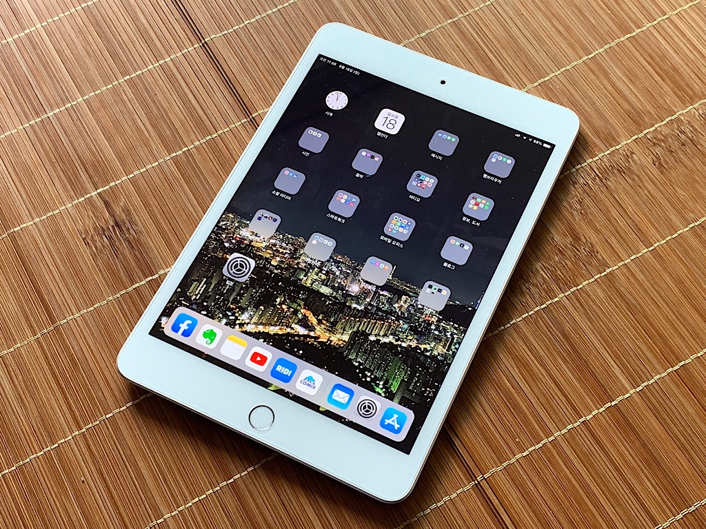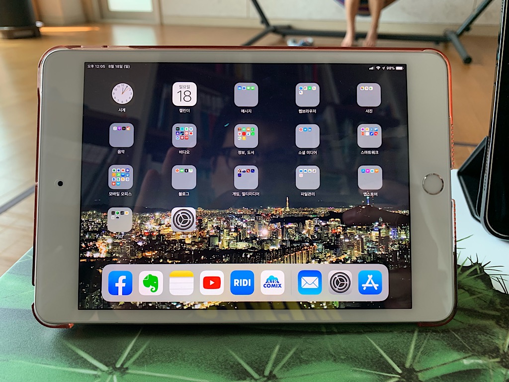 아이패드 미니 5를 거치했을 때의 모습 위의 사진은 미니 5를 거치했을 때의 모습이다. 확실히 지금까지 사용하면서 저렇게 거치하면서 쓰는 빈도수는 앞서 세로 모드로 들고 다니면서 쓰는 경우보다 상대적으로 적다. 그래도 가끔은 저렇게 거치하고 쓸 수도 있기 때문에 스마트커버형 케이스를 구입한 것이다. 그리고 우리가 보통 알고 있는 아이패드의 일반적인 UI는 위의 사진처럼 가로 모드로 거치했을 때의 모습이 아닐까 싶다. 하지만 미니 5의 경우 가로 모드보다는 세로 모드로 더 많이 사용하게 되는 것 같다.