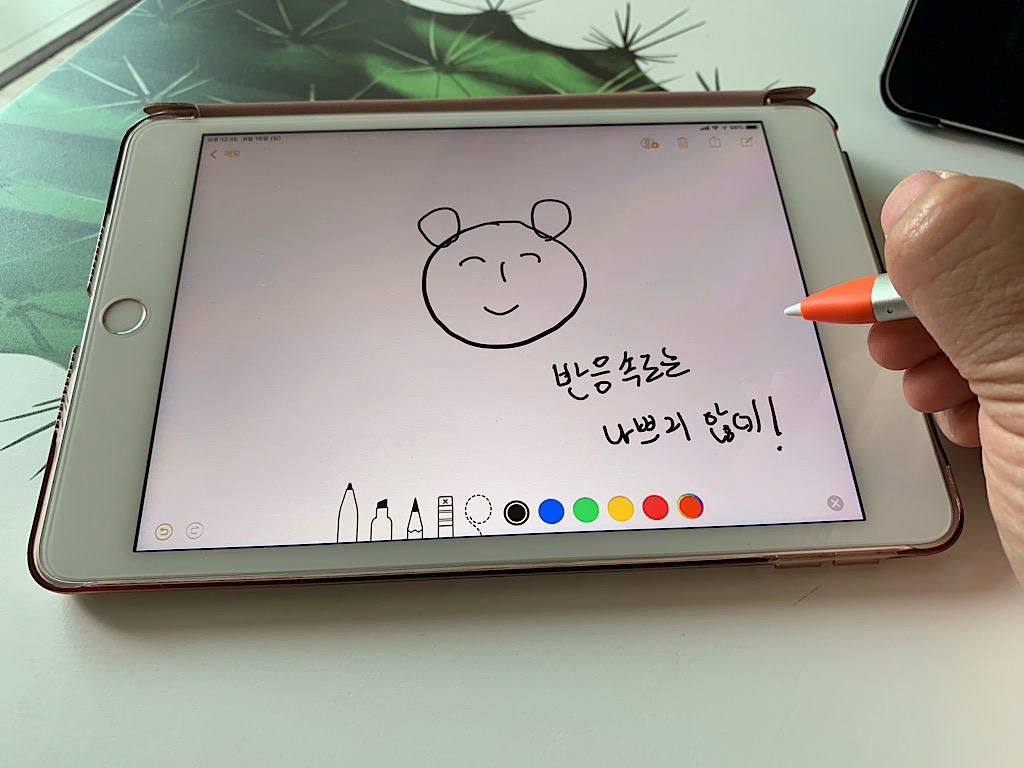 크레용으로 필기를 했을 때의 모습 미니 5에서 크레용으로 필기를 할 때에는 대부분 미니 5에서 기본으로 제공하는 메모 앱을 사용한다. 뭐 다른 앱들도 많이 있지만 기본 메모 앱이 생각보다 성능이 좋아서 메인 손 필기용 앱으로 사용하고 있다. 반응 속도는 밀리는 수준은 아니다. 앞서 미니 5의 성능에 대해서 언급을 했는데 그래도 명색이 아이폰 XS, XR과 동급의 CPU를 사용하고 있기 때문에 반응 속도는 아이패드 프로 시리즈급(물론 프로 3 수준까지는 아니고)은 제공해주는 듯 싶다. 필기감이 결코 나쁜 것이 아니라는 얘기다. 내 경우에 앞서 언급했듯 미니 5에 일반 강화유리를 씌웠는데 종이 재질의 필름을 씌워줬다면 필기할 때 종이에 필기하는 느낌이 더할 것이다. 이러면 정말 필기할 맛이 생기지 않을까 싶다. 당장은 아니고 나중에 종이 재질의 필름으로 바꿀까 생각 중이다. 참고로 iPad OS로 업데이트를 하게 되면 반응 속도가 더 빨리질테니 그러면 정말로 필기할 맛이 나지 않을까 싶다.