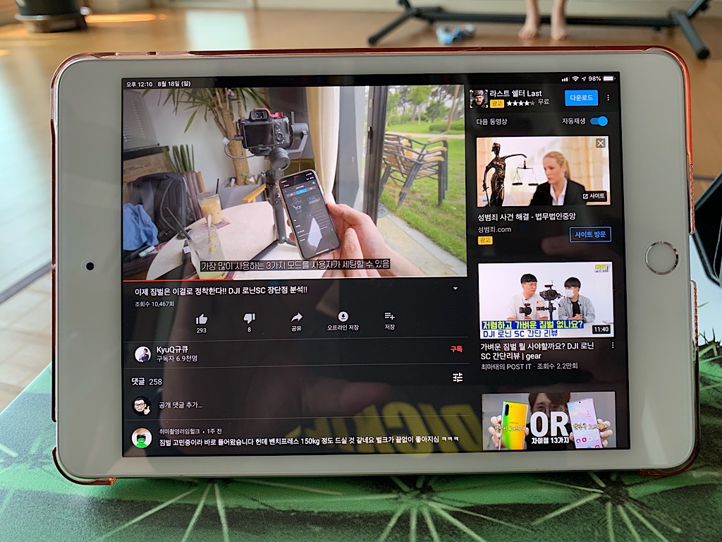 유튜브를 세로 모드로 봤을 때의 모습 앞서 잠깐 언급했지만 4:3의 디스플레이 비율이 전자책(만화책, 일반 서적 다 포함하여)을 보는데 있어서 매우 괜찮은 비율일 수는 있지만 동영상을 시청하는데 있어서는 많이 아쉬운 비율이다. 대부분의 동영상이 16:9, 16:10, 혹은 2:1 비율로 만들어지기 때문이다. 극장용 영화는 21:9 비율로 만들어지기도 하다. 그렇기 때문에 4:3 비율의 미니 5에서는 전체 화면으로 볼 때 위, 아래에 생기는 레터 박스로 인해 디스플레이 효율이 그닥 좋지는 못하다.