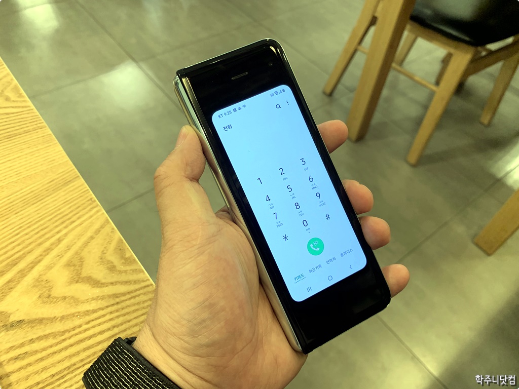 커버 디스플레이 때의 그립감 아마도 갤럭시 폴드를 만약에 샀을 때(내가 살 일은 없을 듯 싶다. 가격도 그렇고 -.-) 어떤 의미에서 가장 많이 사용하게 될 모드가 저 접었을 때의 모습, 즉 커버 디스플레이 모드가 아닐까 싶다. 펼쳐놓고 다니기에는 좀 그렇다. 접었을 때는 나름 두께도 있기는 하지만 그래도 4.6인치의 디스플레이 크기와 기다란 방식의 디자인 덕분에 한손으로 뭔가를 입력하는데 있어서 최적의 그립감을 보여준다. 전화를 걸거나 문자를 보내거나 간단한 정보를 확인하는데 있어서 일반 스마트폰을 쓰는 것과 비슷한 사용자 경험을 제공하지 않는가 싶다.
