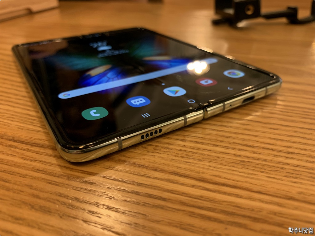 갤럭시 폴드의 펼쳤을 때의 아래쪽 모습 갤럭시 폴드를 펼친 다음에 밑에서 비스듬하게 봤다. 앞서 언급했던 것처럼 스피커와 USB-C 타입 포트가 보인다. 그리고 접히는 부분에 마감이 확실히 이전에 처음 공개되었을 때보다는 깔끔해졌다는 생각이 든다. 하지만 접히는 부분을 자세히 보면 살짝 티가 나는 것은 어쩔 수 없을 듯 싶다. 밑에서도 얘기하겠지만 정면으로 볼 때에는 접히는 부분이 잘 인지가 안된다. 그만큼 괜찮았다. 하지만 정면이 아닌 다른 각도에서 봤을 때는 약간의 울렁거림(?) 같은 옴폭 패이거나 튀어나오는 것 같은게 보이는 것은 어쩔 수 없는 듯 싶다.