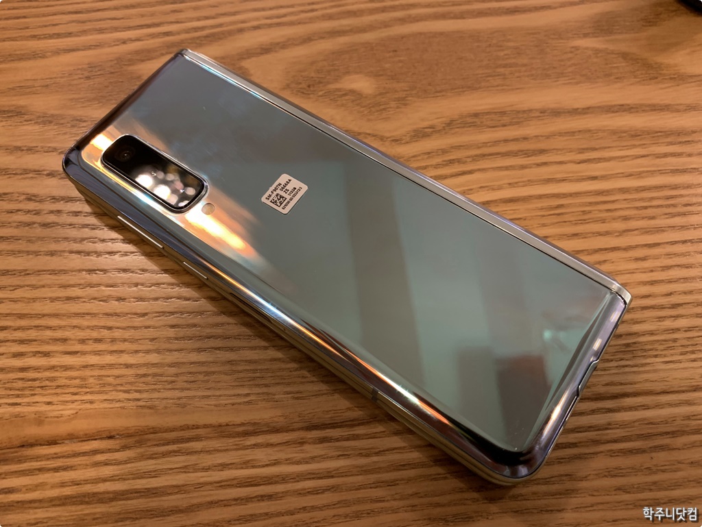 갤럭시 폴드의 펼쳤을 때의 뒷쪽 모습 갤럭시 폴드를 펼친 다음에 뒤집었을 때의 모습이다. 뭐 펼친 다음에도 뒤집었을 때 뒷면의 카메라는 역시나 메인 카메라가 된다. 인피티니 플랙스 디스플레이가 동작하고 있을 때에는 당연한 얘기겠지만 커버 디스플레이가 동작하지 않는다. 그런데 저렇게 보니 한쪽은 실버, 한쪽은 블랙.. 참으로 뭔가 이질적인 느낌이 들기는 하다.