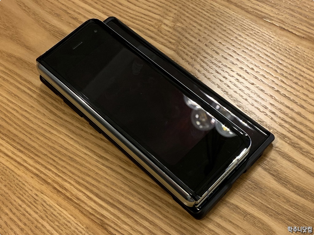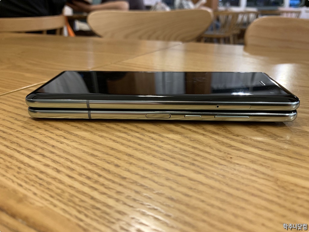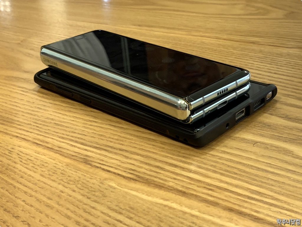 갤럭시 노트 10+와 갤럭시 폴드의 두께 비교 갤럭시 노트 10+가 있어서 두께를 좀 비교해봤다. 물론 갤럭시 노트 10+는 케이스를 씌운 상태이기 때문에 정확한 비교는 어렵겠지만 대략적으로, 느낌적으로 알 수 있을 듯 싶기도 하다(ㅋㅋ). 위의 사진에서 보면 알 수 있듯 케이스를 씌운 갤럭시 노트 10+보다 확실히 두껍다. 대략 1.5cm 정도가 나오기 때문에 어쩔 수는 없는 듯 싶다.