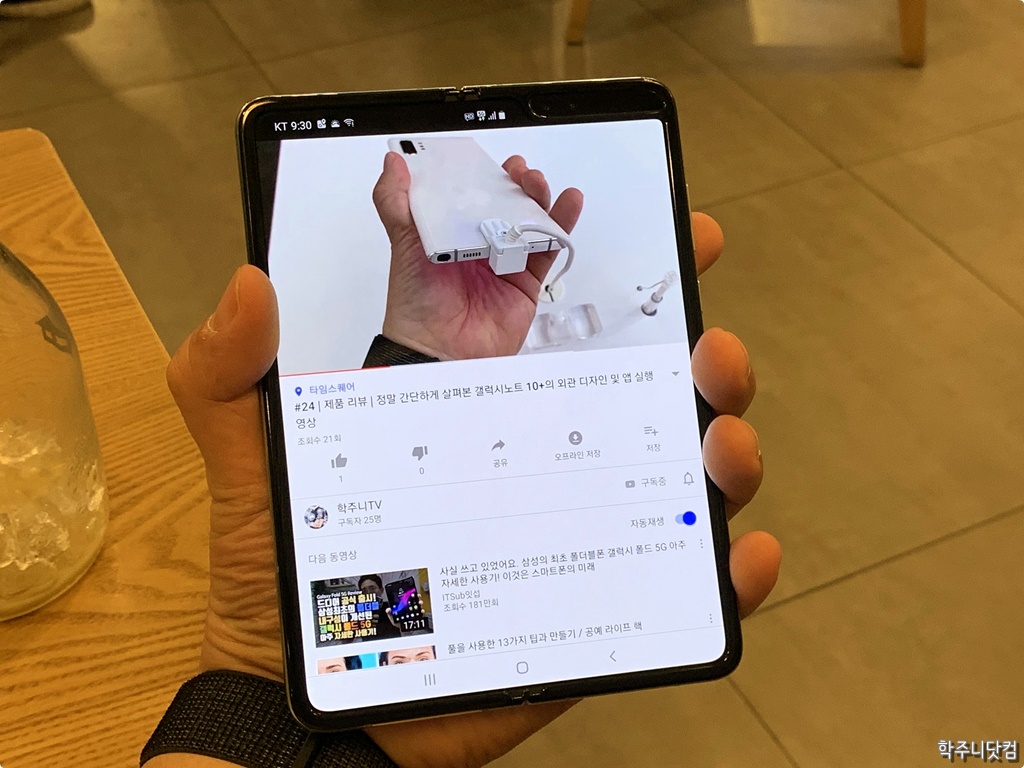 인피니티 플랙스 디스플레이에서 연결되어 나오는 유튜브 전체 화면 모습 커버 디스플레이에서 유튜브를 전체 화면으로 띄우고 보고 있다가 갤럭시 폴드를 펴쳐 메인 디스플레이인 인피니티 플랙스 디스플레이를 활성화 했을 때 커버 디스플레이에서 보였던 유튜브 화면이 그대로 전체 화면으로 이어져서 보이는 것을 확인했다. 유튜브 뿐만이 아니라 구글 지도 역시 잘 되는 것을 확인했고 갤럭시 폴드에 기본으로 설치되어 있는 앱들은 대부분 앱 연결이 잘되는 것을 확인해봤다. 짧은 시간만 만졌기 때문에 많은 앱들을 테스트 해보지 못했지만 그런대로 잘 되는거 같다 보이기는 하다.