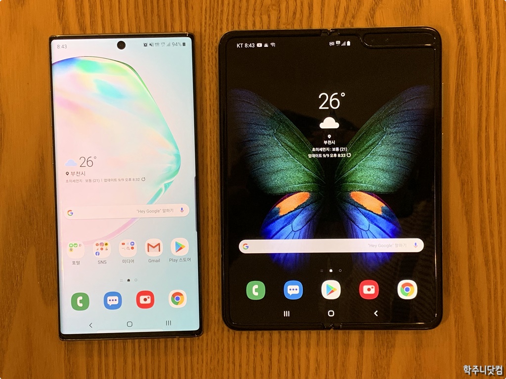 갤럭시 노트 10+와 접었을 때의 갤럭시 폴드 갤럭시 노트 10+와 갤럭시 폴드를 접었을 때, 즉 커버 디스플레이 동작 모드일 때의 크기를 비교하면 뭐 아무래도 갤럭시 노트 10+이 더 큰 것은 당연하다. 4.6인치의 커버 디스플레이를 가진 접었을 때의 갤럭시 폴드와 6.8인치의 갤럭시 노트 10+를 비교하는 것은 어불성설이다. 그런데 딱 보면 2.2인치의 차이가 남에도 불구하고 크기를 생각할 때 차이가 별로 안난다. 갤럭시 폴드의 커버 디스플레이는 위, 아래로 레터 박스가 너무 많이 생기기 때문에 뭔가 손해를 보는 것 같은 느낌이 들기는 하다.