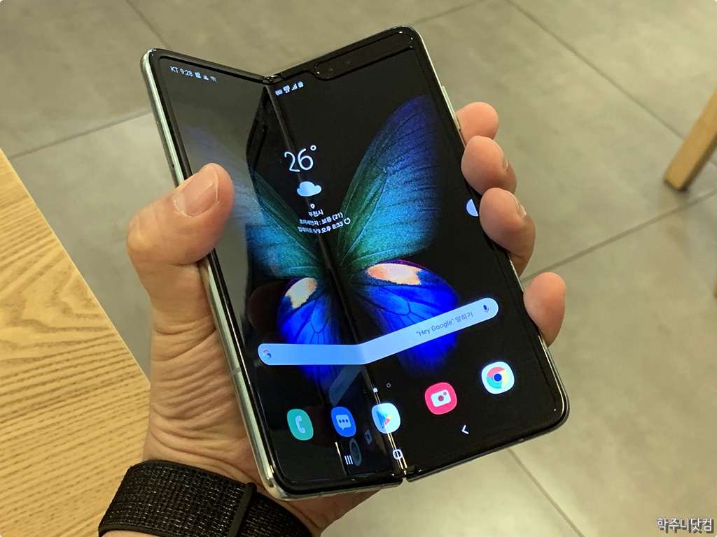 세게 쥐면 접힌다.. 다만 위의 사진처럼 펼친 상태에서 저렇게 쥐어을 때 힘을 좀 많이 주면 가운데 접히는 부분의 힌지가 손의 압력을 못견디고 접힐 수도 있다. 물론 어지간히 힘을 주지 않는 이상, 일반적으로 그냥 잡는 정도의 세기로 갤럭시 폴드를 잡는다면 저렇게 접히는 경우는 별로 없을 듯 싶다만 그래도 폴딩 방식의 스마트폰이기 때문에 이런 부분은 감안을 해줘야 할 듯 싶다.