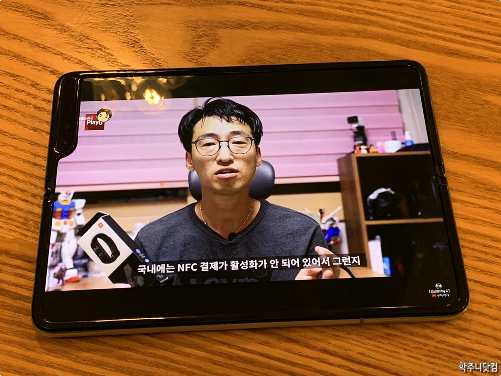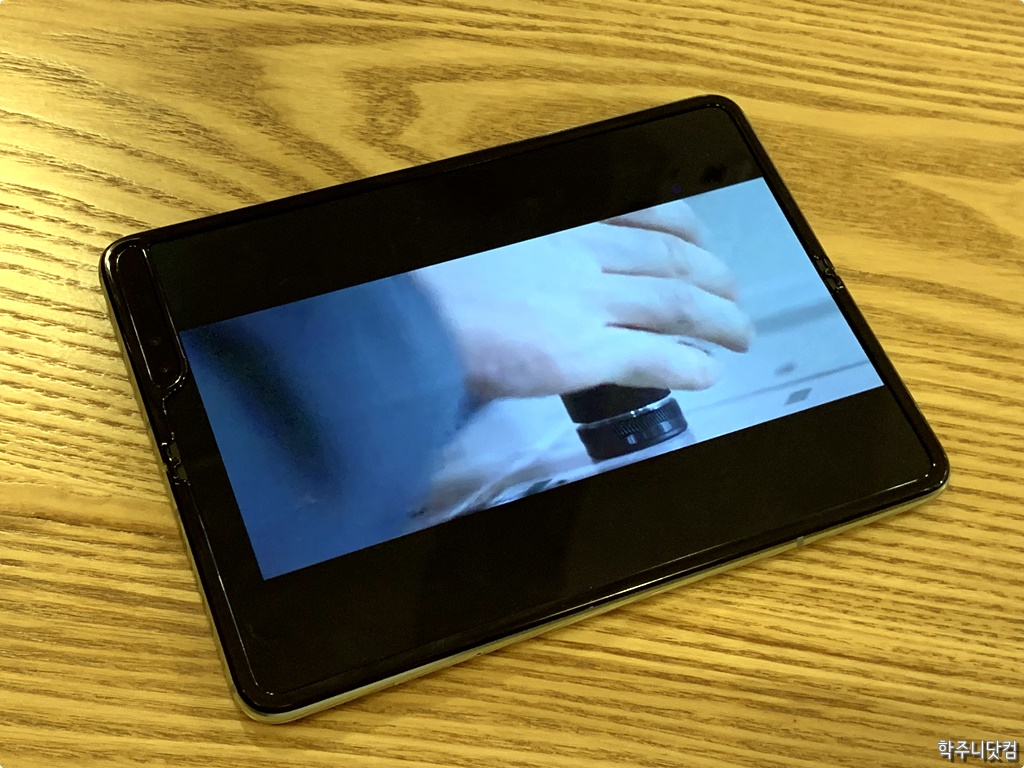 갤럭시 폴드를 펼친 상태에서 가로 모드 앞서 갤럭시 폴드를 펼친 상태에서 잡을 때에는 세로 모드였다. 가로 모드로 바꾼 상태에서는 뭐 아무래도 한 손으로 쥐기는 좀 불편했다. 그리고 전체 화면으로 뭔가를 볼 때에는 갤럭시 폴드의 배젤이 얇기 때문에 한 손으로 잡기에는 좀 불편한 것이 사실이다. 이런 경우에는 양손으로 컨텐츠를 가리지 않고 잡는 것이 좋을 듯 싶다.