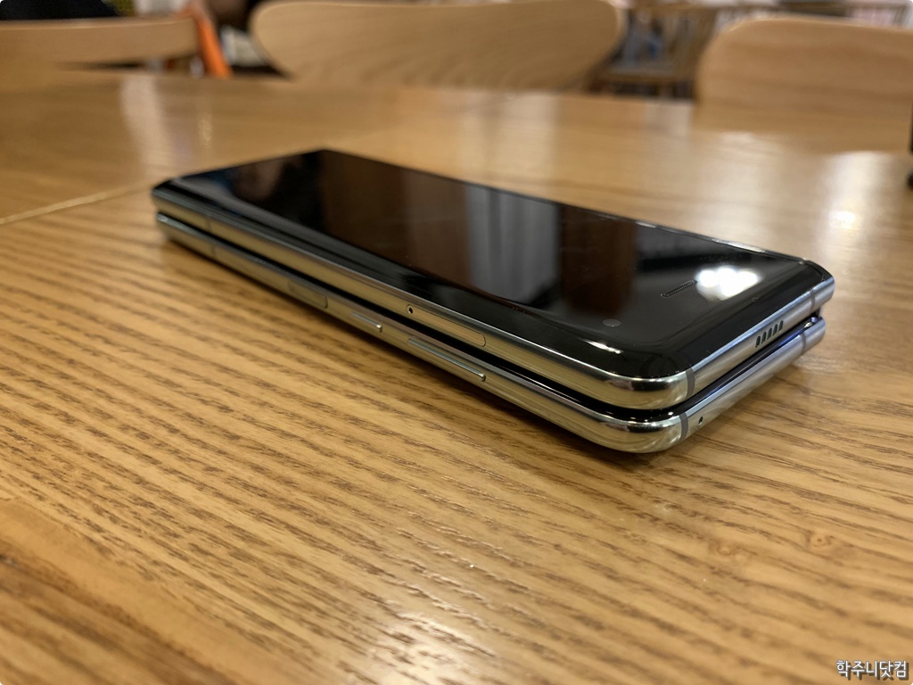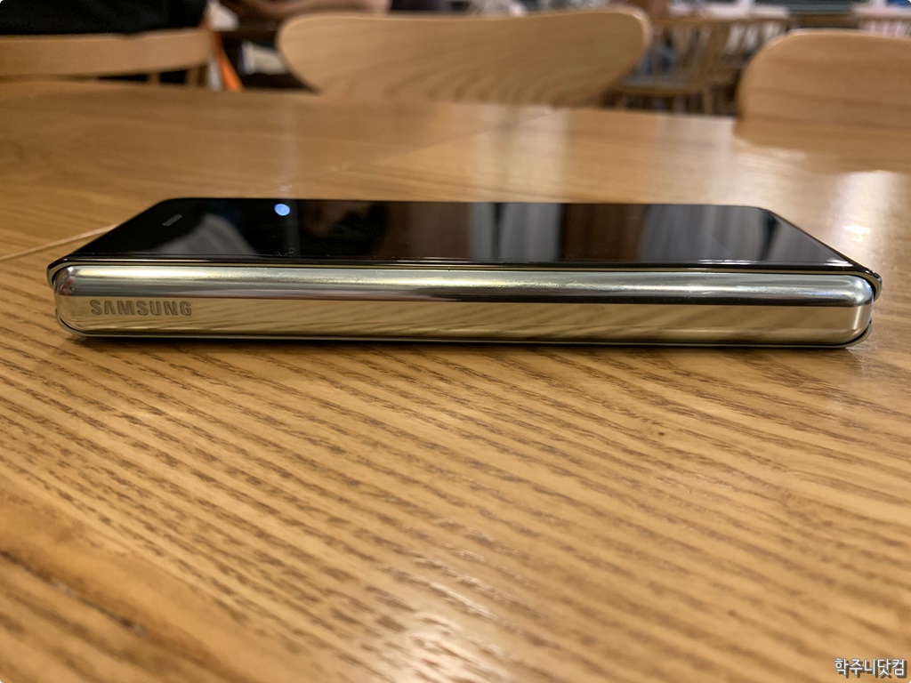 갤럭시 폴드의 펼쳤을 때의 윗쪽 모습 갤럭시 폴드를 펼쳤을 때 위에서 본 모습인데 역시 스피커가 보인다. 그리고 위에서 보면 노치 부분이 확실히 보이며 또 앞서 언급했던 것처럼 접히는 부분에 약간의 울렁거림이 나타난다. 아직까지 폴딩 방식의 디스플레이가 가질 수 밖에 없는 약점이 아닐까 싶기도 하고 말이다. 그래도 정면에서 볼 때에는 이런 모습이 거의 보이지 않아서 그 부분은 확실히 잘 만들었구나 하는 생각이 들었다.