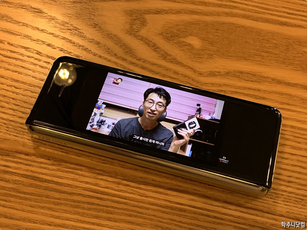 커버 디스플레이에서 유튜브를 실행했을 때 커버 디스플레이에서의 앱 실행은 전혀 문제가 되지 않는다. 커버 디스플레이는 그냥 디스플레이가 작을 뿐이지 성능에 전혀 문제가 되지 않는다. 당연한 것이 커버 디스플레이를 위해 별도의 프로세서가 있는 것이 아니라 갤럭시 폴드의 메인 프로세서가 그대로 작동하면서 디스플레이의 크기가 좀 작은 디스플레이도 내용이 보이는 것 뿐이다.