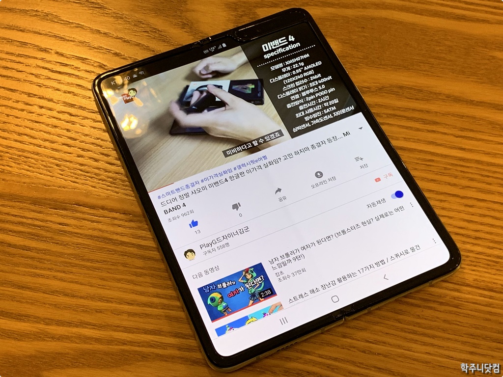 인피니티 플랙스 디스플레이의 세로모드에서의 유튜브 실행 모습 갤럭시 폴드에서 유튜브를 실행시켜봤다. 저 모습은 세로 모드일 때인데 느낌이 마치 아이패드 미니에서 유튜브 앱을 실행시켜서 세로 모드로 본 것과 같다. 영상이 보이고 밑에 설명이 보이는데 그 비율이 결코 나쁘지는 않다. 실시간 채팅을 하면서 영상을 보는 경우에는 이만한 환경도 없을 듯 싶고 말이다(ㅋㅋ).