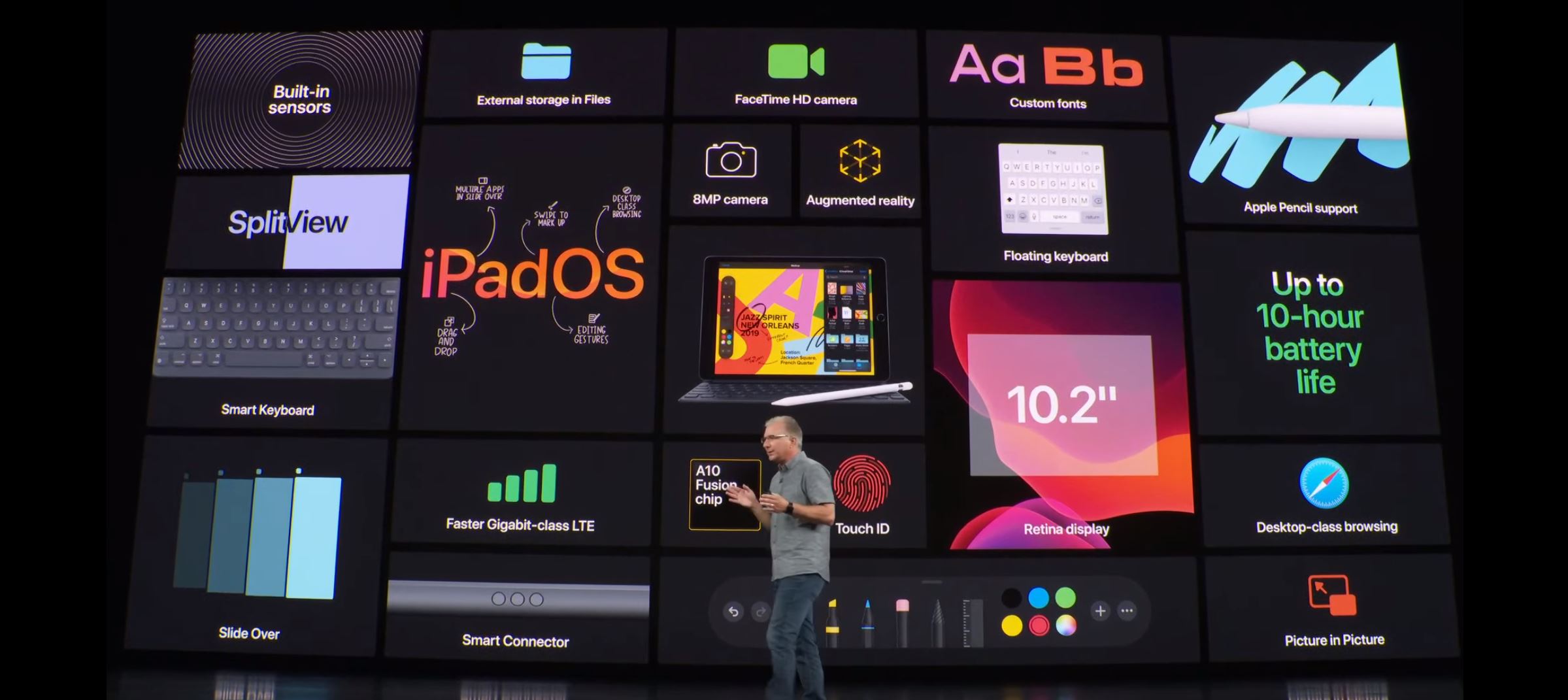 아이패드 7세대에 대해서 위의 사진을 보면 얼추 성능을 알 수 있는데 솔직히 핵심은 아이패드 7세대에 들어갈 iPad OS가 아닐까 싶다. 설명의 대부분도 iPad OS 쪽에 맞춰져 있었으니 말이다. CPU는 A10 퓨전 칩셋을 사용한다는 것, 그리고 이건 추가된 부분이기는 하지만 스마트 키보드를 지원한다는 것이 달라졌다. 이제 아이패드 시리즈는 아이패드 미니를 제외하고는 다 스마트 키보드를 지원하는 방식으로 변경되었다고 봐도 좋을 듯 싶다.