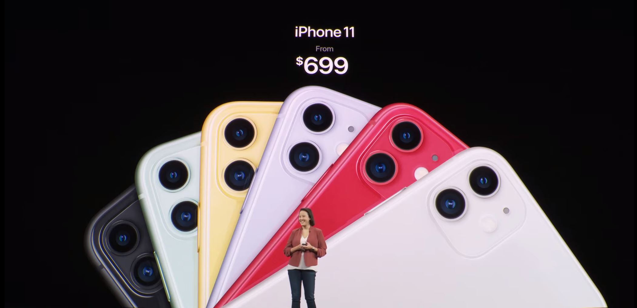 아이폰 11은 6가지 색상(보라색, 노랑색, 녹색, 검정색, 흰색, 빨간색)으로 나오며 64GB, 128GB, 256GB의 용량으로 나온다. 가장 중요한 것은 역시나 가격인데 기본 모델인 64GB 모델이 $699에서 시작한다. 밑에서도 언급하겠지만 애플 스토어에서 보상 판매를 통해서 구입한다면 $399에도 구입이 가능하다. 9월 13일에 선주문을 받는다고 하며 정식 출시는 아마도 9월 20일이 되지 않을까 싶다. 그리고 당연히 한국은 1차 출시국에 들어가지 않을 듯 싶다(참고로 출시 날짜는 공개하지 않았다. 애플 공식 홈페이지에도 선주문만 되어 있다).