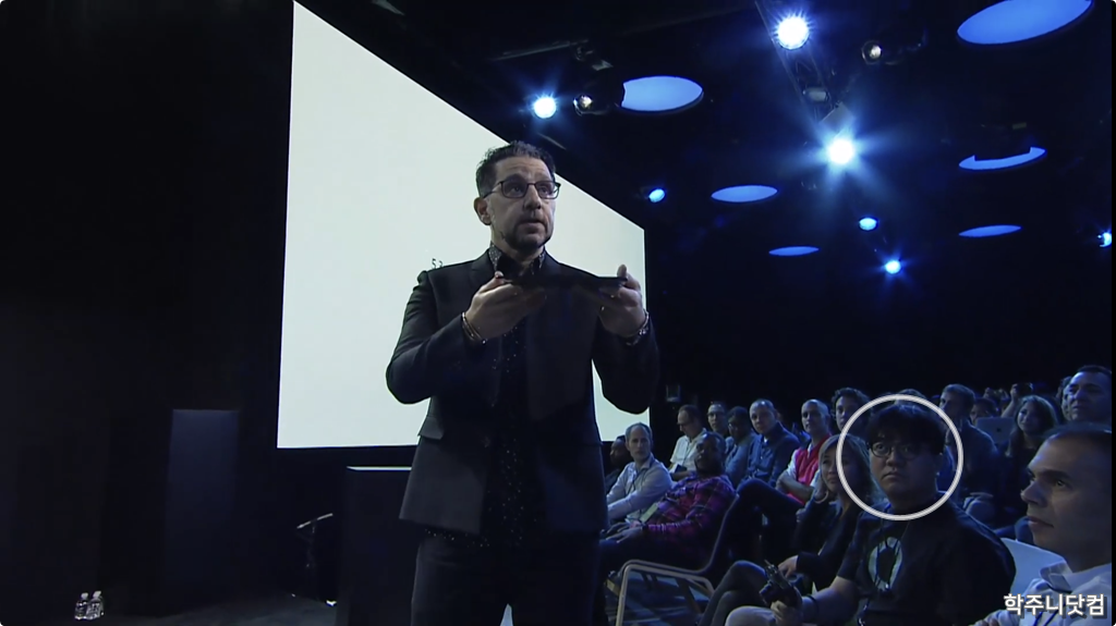 이번 MS 서피스 이벤트 2019에 보면 반가운(?) 얼굴이 영상 속에 등장한다. 무적전설이라고 불리는 MS MVP인 지인이 뉴욕에 갔다가 이 행사에 참여했는데 맨 앞좌석에 앉게 되어서 행사 영상에 잡혔다. 아래가 그 증거사진이다. ㅋㅋ