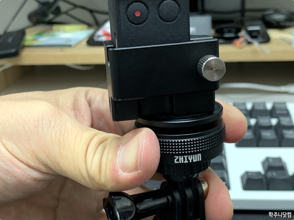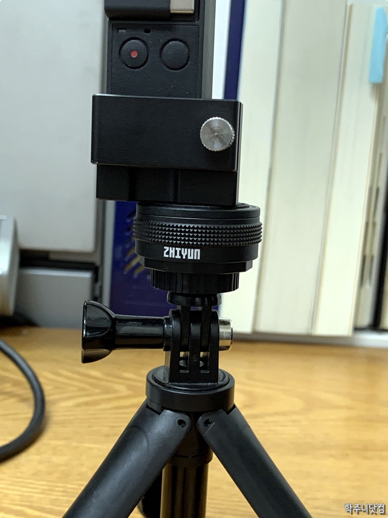 그렇다면 실제로 내 경우에는 어떻게 사용하는지 살펴보자. 개인적으로 오즈모 포켓을 이용하는데 알다시피 오즈모 포켓은 아쉽게도 3.5mm 나사 구멍이 존재하지 않는다. 그래서 트라이포드에 끼워서 사용하려면 별도의 악세서리가 필요하다.