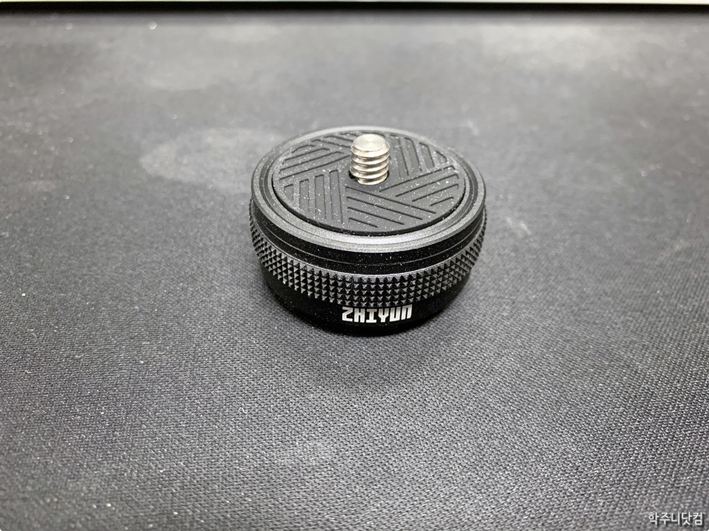 트랜스마운트 중간에, 즉 지윤(ZHIYUN) 로고 위에 오돌도돌하게 원형 돌기가 있는데 이것을 밑으로 잡아 당기면 순쉽게 상판과 하판을 분리할 수 있다.
