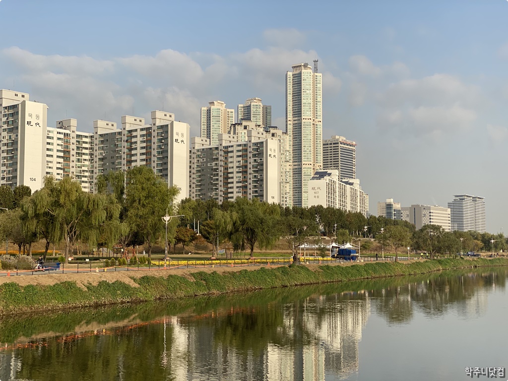 위의 사진은 아침에 걸어서 회사로 출근할 때 안양천에서 목동을 바라보며 찍은 사진이다. 주로 밤에 많이 찍는데 이번에는 화각 비교를 위해 아침에 찍어봤다. 위의 사진은 광각일 때의 모습이다.