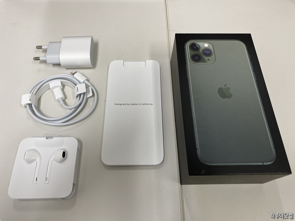 아이폰11프로의 패키지 안에 있는 구성품은 아이폰11프로 단말기를 제외하고 위와 같다. 유심 핀셋이 있는 설명서 뭉치(?)와 USB-C to 라이트닝 케이블, 고속 충전기, 그리고 라이트닝 케이블로 된 이어팟이 들어가 있다. 충전 케이블이 이전에 USB-A 형식의 라이트닝 케이블이 아닌 USB-C 형식의 라이트닝 케이블로 바뀌었다. 그 얘기인 즉, 충전기의 포트가 예전과 같은 USB-A 타입이 아닌 USB-C 타입이라는 얘기다.