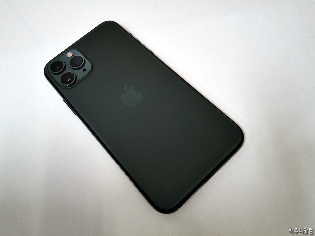 뒷면의 재질은 무척이나 매트하다는 생각이 든다. 번들거리지 않고 미끄럽지 않아서 좋았다. 만졌을 때 부드럽지만 미끄러지지 않는 느낌이 무척이나 괜찮았다. 내 경우에는 미드나잇 그린 색상을 선택했는데 이번 아이폰11프로 시리즈에서 처음으로 적용된 색상으로 요즘 핫한 색상(?)이라고 생각이 들었다. 이런 색상은 무조건 투명 케이스를 끼워서 색상을 유지하도록 하는 것이 좋다고 생각이 든다. 어찌되었던 재질 자체는 무척이나 맘에 들었다.