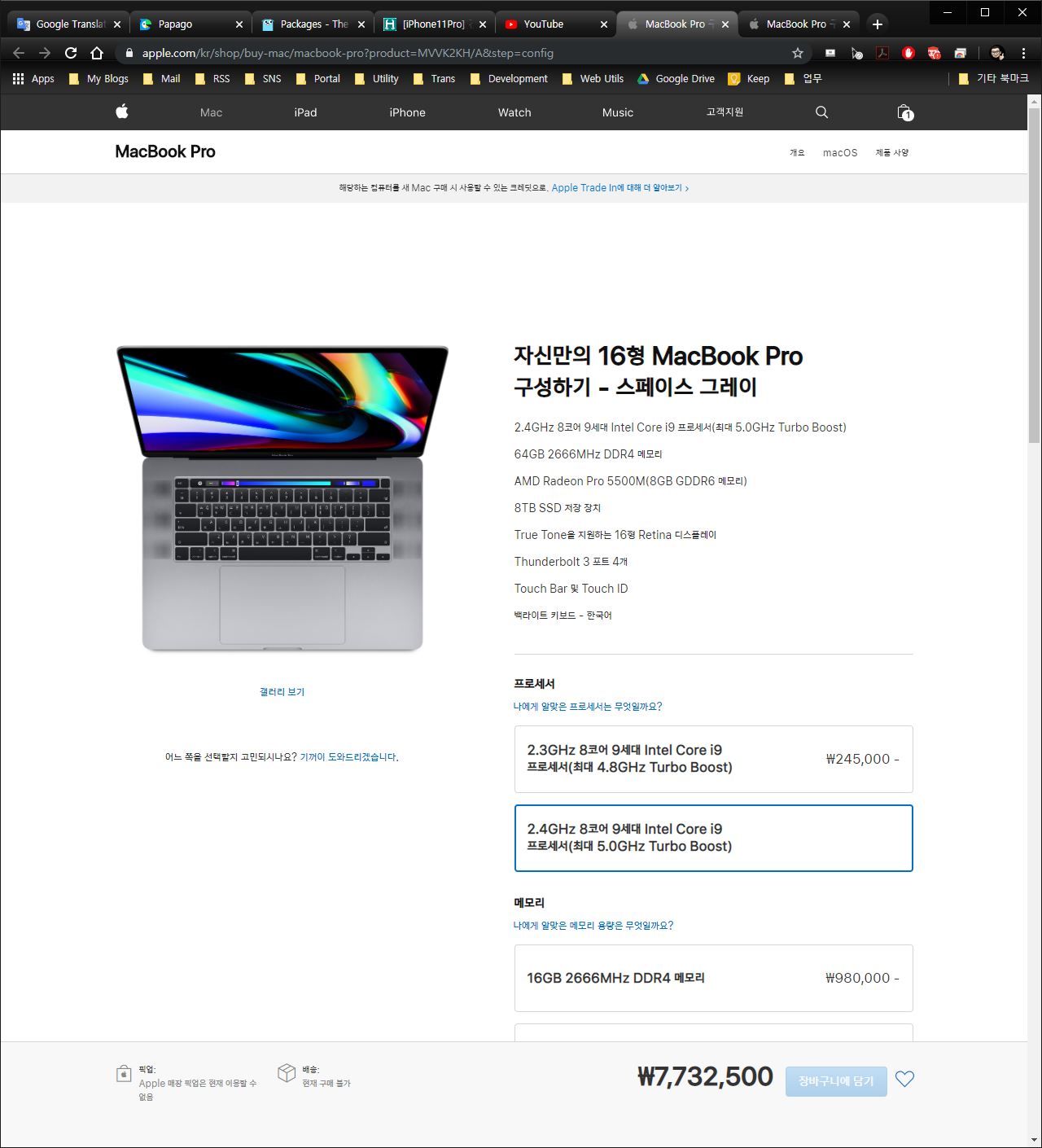 뭐 압도적인 성능을 보여준 만큼 가격도 역시 후덜덜하다는 생각이 든다. 기본형(이라고 말하고 최소 사양이라고 읽는다)의 경우 2.6GHz 6코어 코어 i7 프로세서에 16GB 메모리, 512GB SSD, 라데온 프로 5300M(4GB VRAM)이 탑재되었는데 이거 가격이 319만원이다. 즉, 이 가격부터 시작한다고 보면 된다. 앞서 언급한 최대 사양으로 올리면