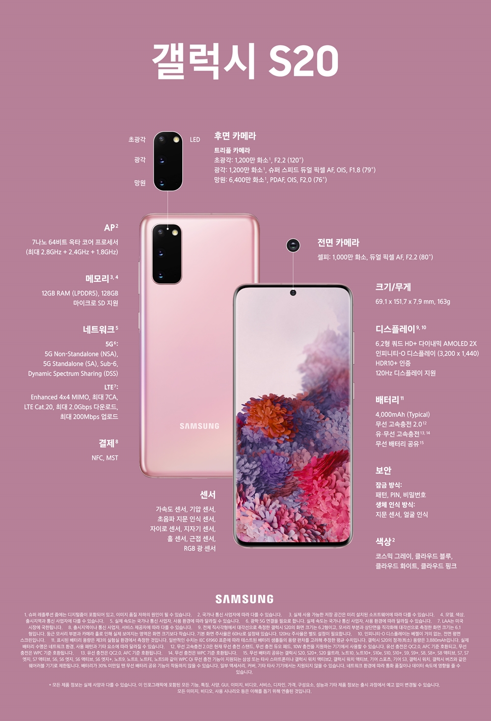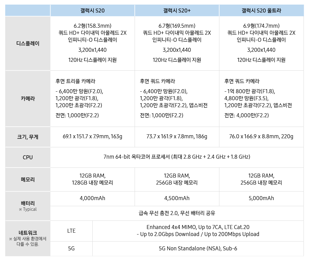 국내 출시 모델의 세부 사양 위의 표는 국내 출시 예정인 갤럭시 S20 시리즈들의 세부 사양을 표로 정리한 것이다. 이 역시 삼성 뉴스룸에서 제공해줬다.