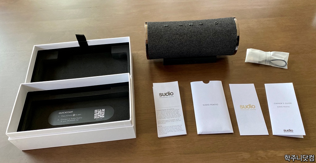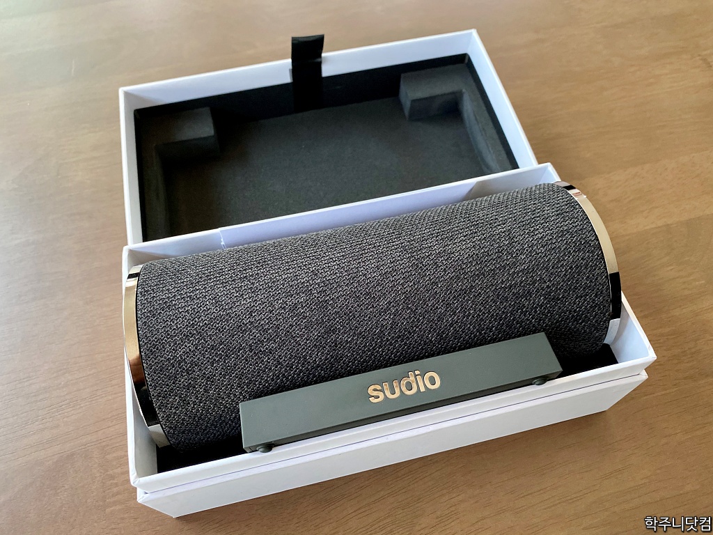 펨티오 박스 오픈 펨티오 박스를 열어보면 위와 같이 펨티오 본체의 모습을 볼 수 있다. 하단의 수디오 로고가 강렬하게 보이는 내부 구성이다. 원통형 모양에 패브릭 재질로 덮여있고 양쪽 끝에 메탈 재질로 마감되어 있는 것이 특징이다. 디자인에 대한 부분은 밑에서 다시 언급하도록 하겠다.