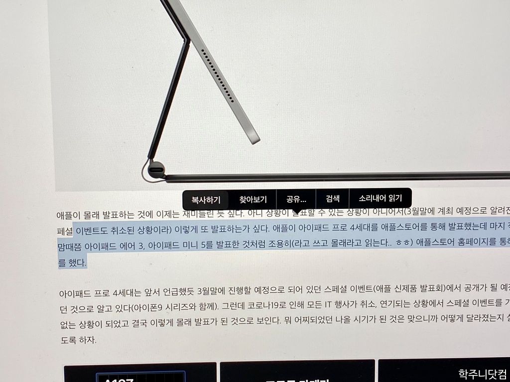 그리고 텍스트가 선택된 상태에서 마우스 오른쪽 버튼(즉, 보조 버튼)을 누르니 텍스트 관련 보조 메뉴가 보이는데 여기서 복사하기, 찾아보기, 공유, 검색, 소리내어 읽기 등을 선택할 수 있다. 다른 것은 모르겠고 복사하기를 눌렀더니 복사가 되더라. 아래처럼 말이다.