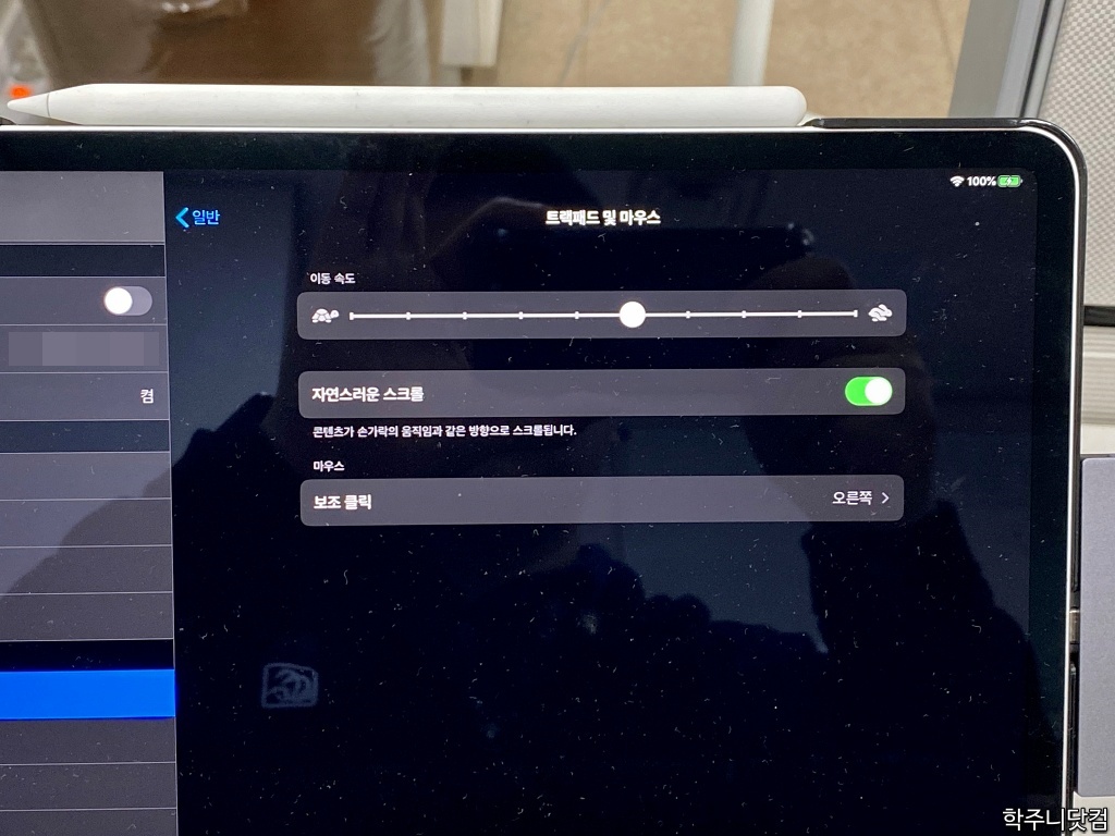 설정의 일반 항목에 보니 기존에 없었던 트랙패드 및 마우스 항목이 생겼다. 참고로 트랙패드를 연결하지 않았지만 저렇게 메뉴가 보인다. 마우스든 트랙패드든 연결하면 저렇게 나오는 듯 싶다.
