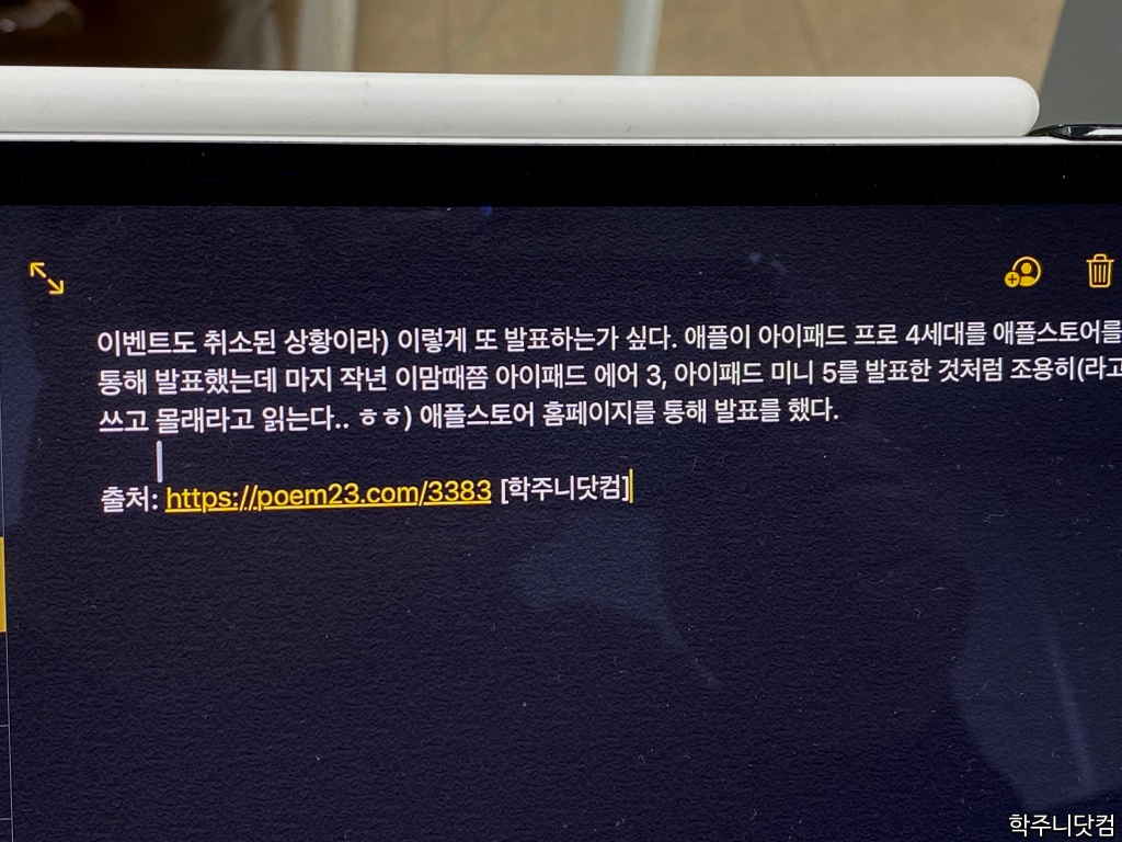 위와 같이 앞서 복사한 텍스트가 붙여넣기가 되었다. 이거 이제 아이패드에서 문서 작업이나 뭔가 다른 작업을 할 때 마우스를 이용하면 훨씬 일을 하는데 있어서 더 편해질 듯 싶다. 아이패드는 앱을 2개 동시에 띄우고 화면 분할로 실행할 수 있으니 한쪽에 웹브라우저 띄우고 다른 한쪽에 메모 앱을 띄워서 복사해서 편집하기 쉬워질 듯 싶다.
