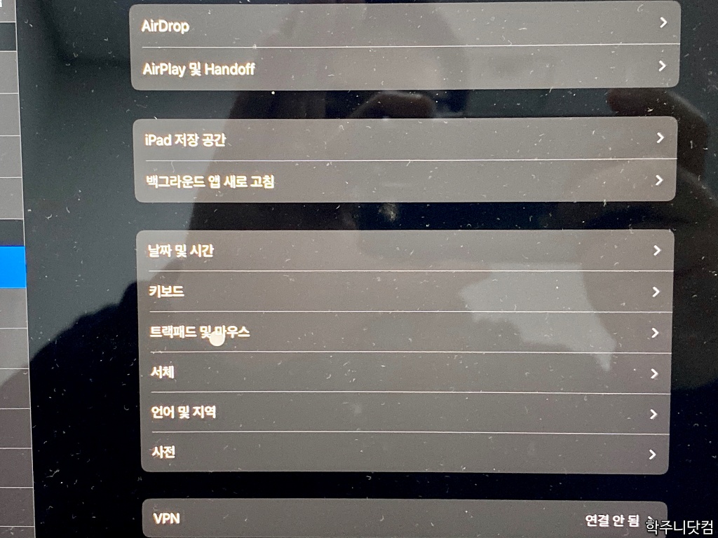 설정의 일반 항목에 보니 기존에 없었던 트랙패드 및 마우스 항목이 생겼다. 참고로 트랙패드를 연결하지 않았지만 저렇게 메뉴가 보인다. 마우스든 트랙패드든 연결하면 저렇게 나오는 듯 싶다.