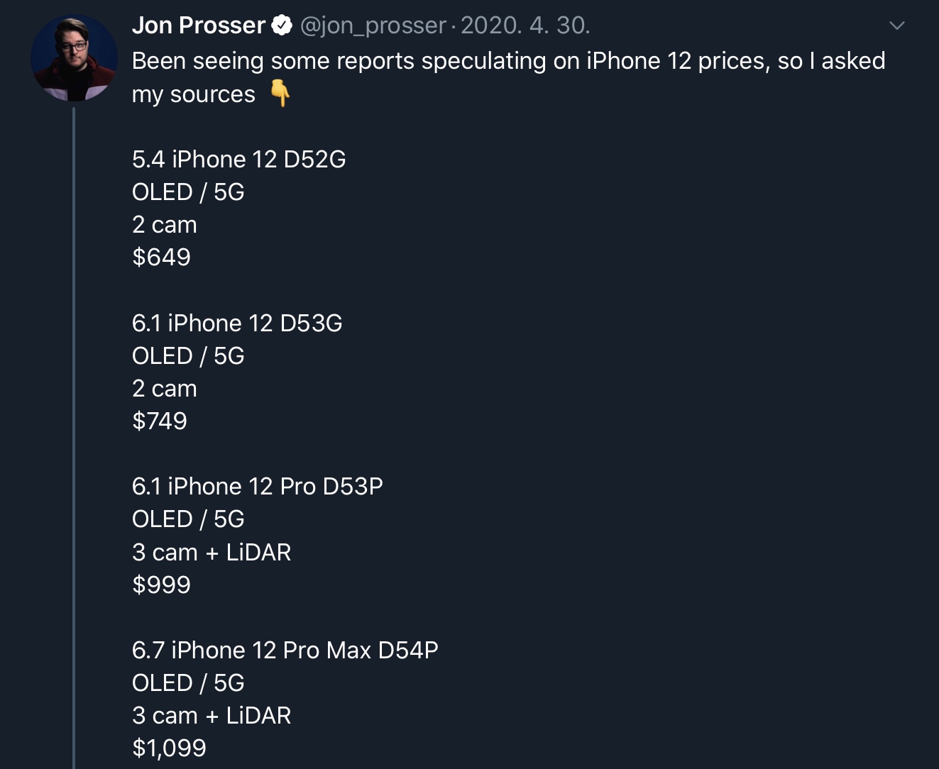 그리고 존 프로서의 트윗대로 나온다면 가장 애매해질 모델이 6.1인치 아이폰 12와 아이폰 12 프로(6.1인치)가 될 것으로 보인다. 이전 시리즈 같으면 IPS LCD, OLED라는 분명한 디스플레이의 차이가 있는데 아이폰 12 시리즈(프로 포함)의 6.1인치 모델들은 둘 다 OLED이기 때문에 차이점은 카메라와 라이다 센서 뿐이다. 그럼에도 불구하고 가격은 무려 $350이나 차이가 난다. 과연 사용자가 저 가격의 차이를 두고 동일한 CPU, 디스플레이를 사용하는 상위 모델을 구입할 것인가라는 의문이 드는 것이 사실이다.