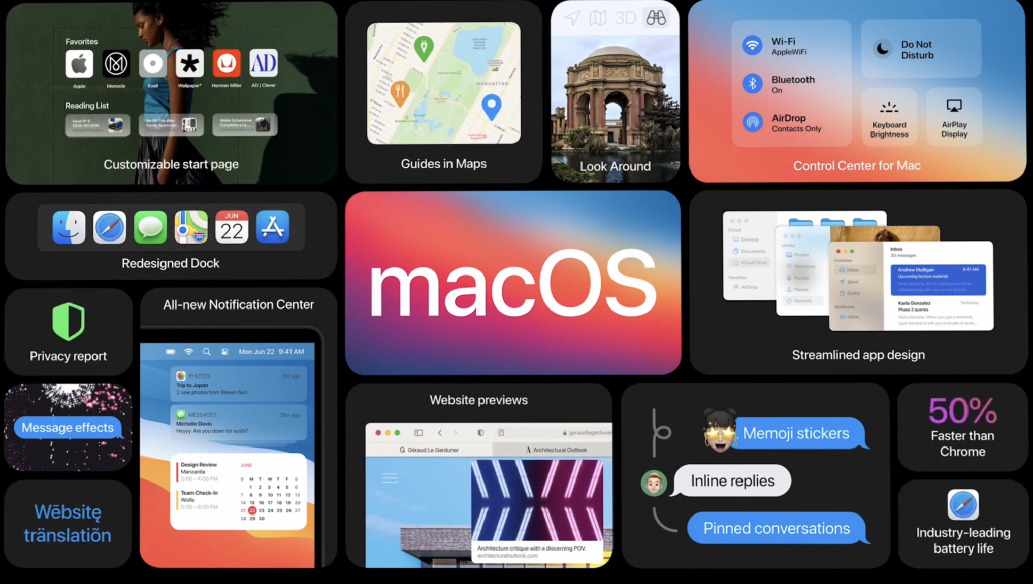 애플은 WWDC 2020을 통해 맥북 시리즈(맥북프로, 맥북에어 등)와 아이맥 시리즈(아이맥, 아이맥 프로 등), 맥 프로 시리즈, 맥 미니 시리즈 등 PC 계열인 맥 시리즈에서 사용하는 OS인 macOS의 신버전을 발표했다. 작년에 발표했던 macOS 10.15 카탈리나의 후속 버전인 macOS Big Sur를 발표한 것이다.