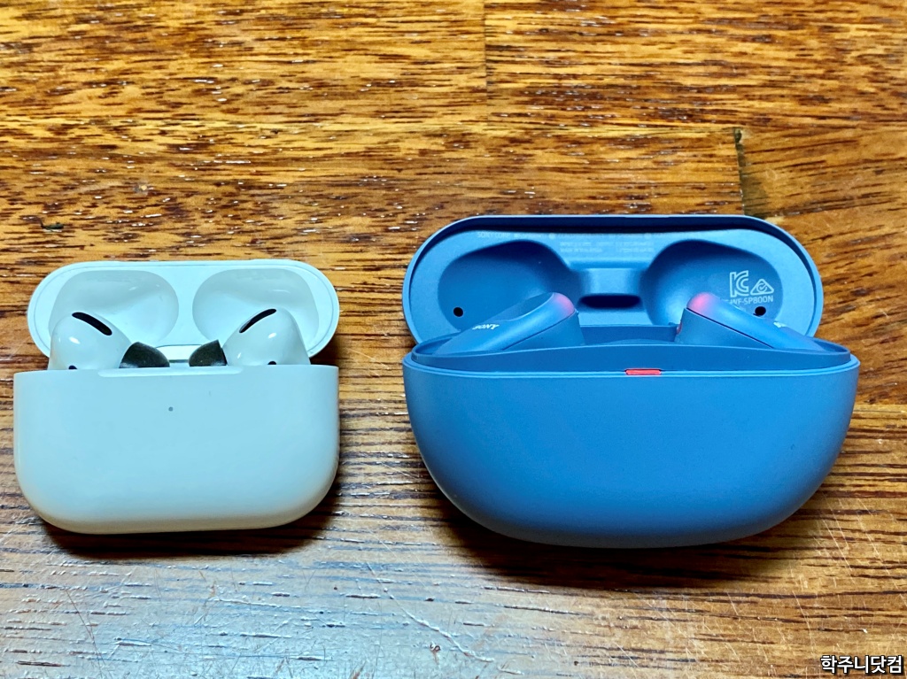 에어팟 프로 케이스와의 비교 앞서 이어버드 얘기도 했는데 에어팟 프로의 이어버드와 WF-SP800N의 이어버드는 크기에서 차이가 난다. 물론 이어후크가 있다는 점에서 착용의 안정감 부분은 WF-SP800N이 에어팟 프로보다는 앞서지만 말이다.