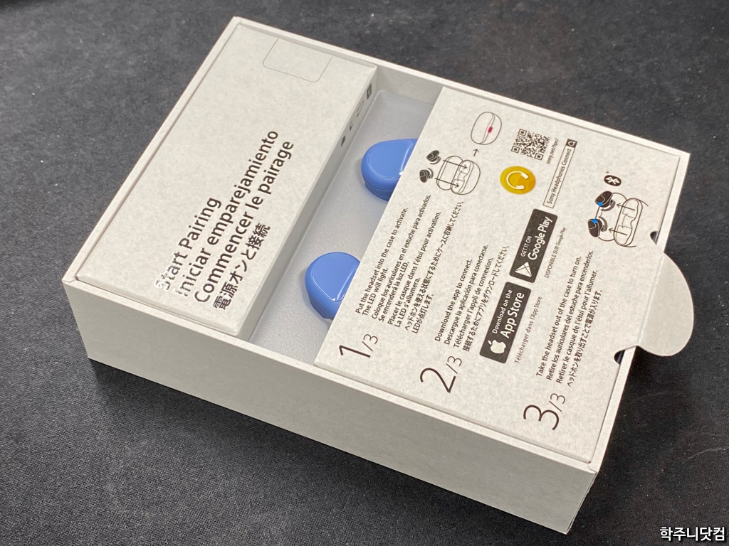 WF-SP800N 속박스(?) 겉 박스에서 속 박스를 꺼내봤다. 어떻게 페어링을 할 수 있는지 간단히 적어서 보여준다. 그리고 앱스토어와 구글플레이를 통해 소니 해드폰앱을 어떻게 다운로드 받는지도 적어뒀다. 참고로 속 박스의 내용은 영어와 정체모를 언어(스페인어와 프랑스어로 추측됨), 일본어로 쓰여져 있며 한글은 없었다(-.-).