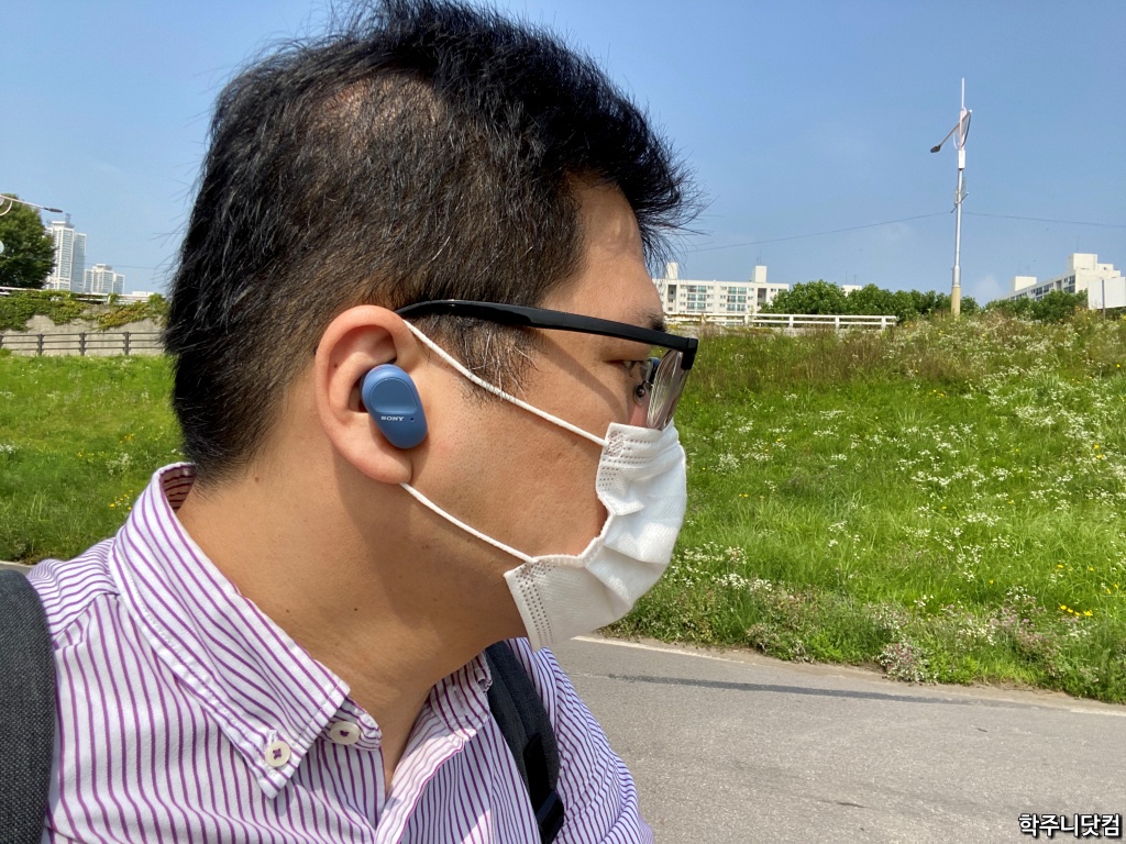 밖에서의 착용샷 WF-SP800N은 역시나 야외에서 쓸 때 빛을 본다. 내 경우 집과 회사의 거리가 그렇게 멀지가 않아서 자전거나 아니면 도보로 출퇴근을 한다. 걸을 때도 그렇기는 하지만 자전거를 탈 때에는 아무래도 완전 무선 이어폰의 경우 좀 불안하다. 지지하는 것이 별로 없기 때문이다.