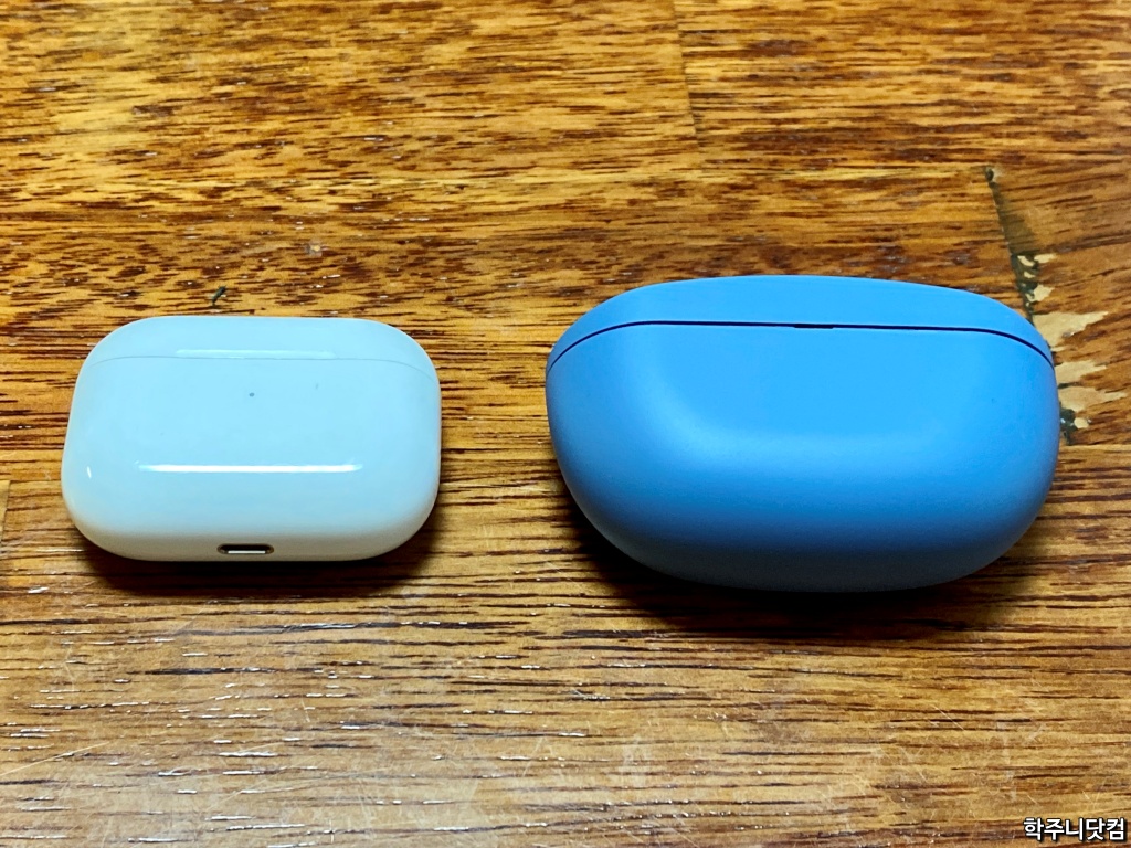 앞서 충전 케이스를 살펴보면서 크기가 살짝 크다고 했었는데 그냥 얘기로 하면 잘 모를 듯 싶어서 에어팟 프로의 케이스와 비교를 해봤다.