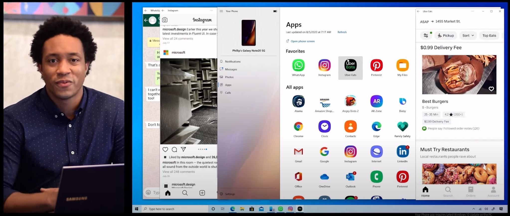 그리고 Link to Windows가 더 강화되었는데 갤럭시 스마트폰이나 갤럭시 태블릿에서 Link to Windows 앱을 실행하면 윈도 10 PC의 Your Phone 앱에서 해당 스마트폰이나 태블릿의 알림, 메시지, 사진 등을 볼 수 있었고 거기에 앱스(Apps)라는 기능이 추가되었다.