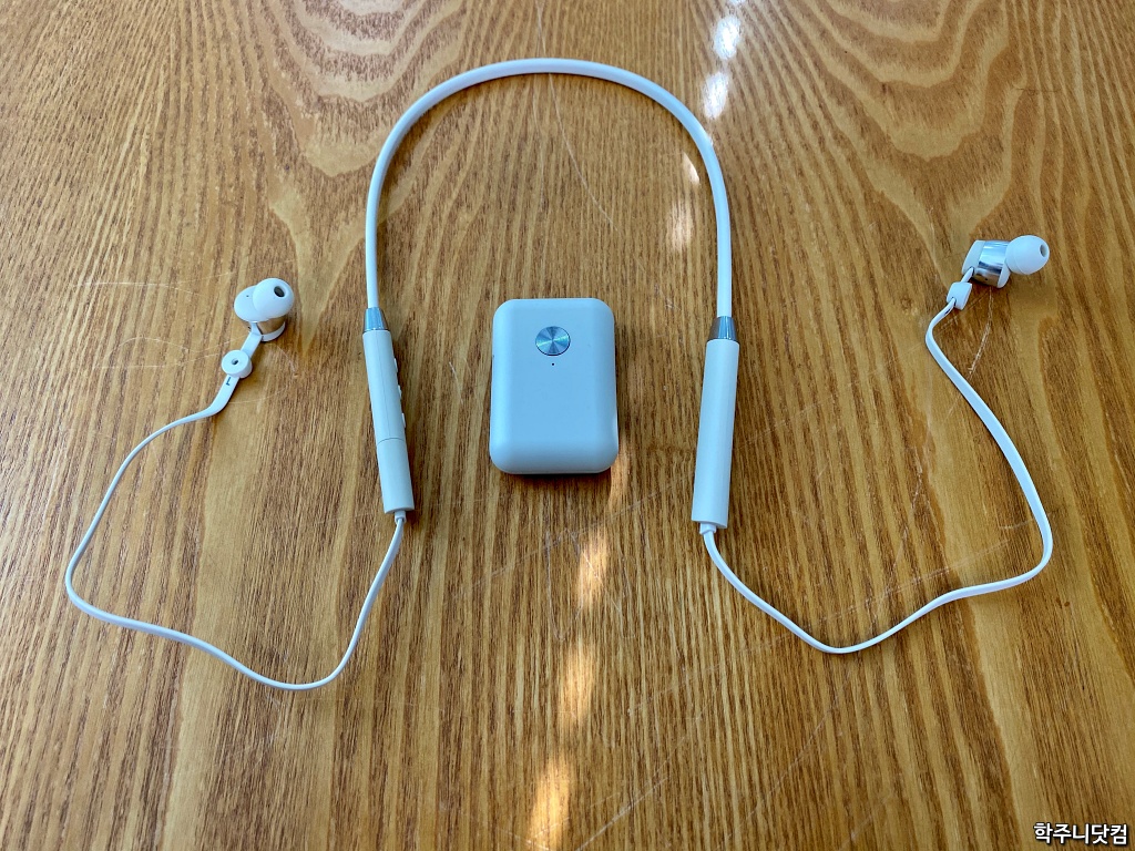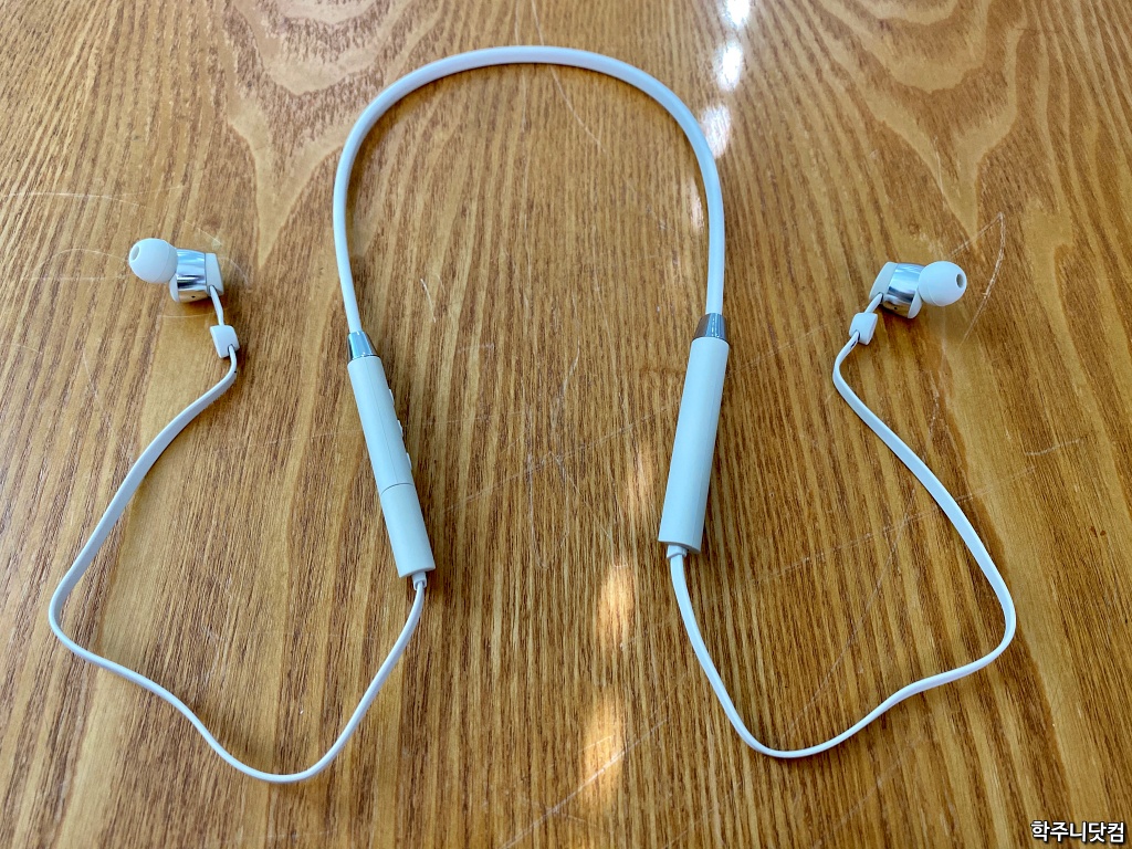 일반 블루투스 무선 이어폰들이 이어팁에만 지지해서 고정되는 방식이어서 불안한 부분이 있는데 저렇게 함으로 목 부분에서 지지해주면서 이어버드는 마치 거치형으로 귀에 꽂으면서 쓰니 훨씬 안정적으로 보인다는 것은 장점이라면 장점일 수도 있다는 생각이 든다.