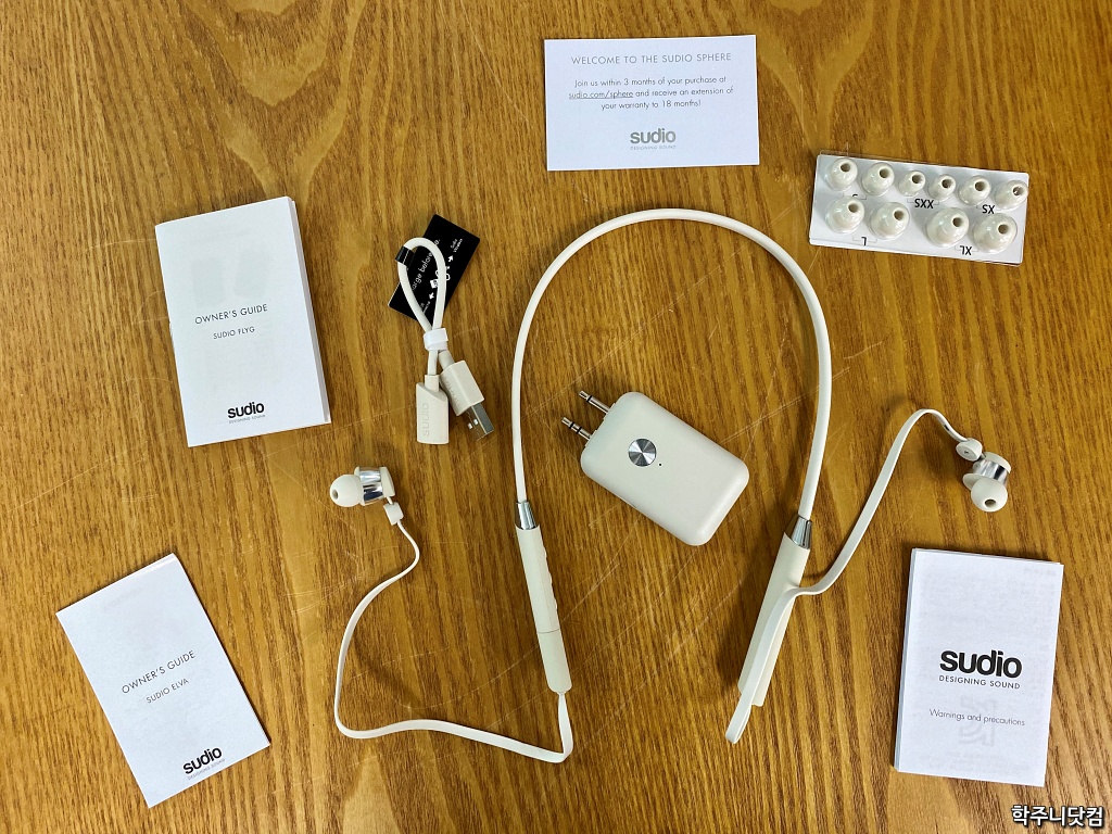 수디오 엘바는 위에서 보는 것처럼 엘바 무선 이어폰 본체와 블루투스 어뎁터, 그리고 엘바의 충전 케이블(인데 좀 이상하게 생겼다)과 크기별 여분의 이어팁, 그리고 각종 설명서들이 있다. 여기에 블루투스 어뎁터 충전용 케이블이 하나 더 있는데 모르고 꺼내지 않았다.