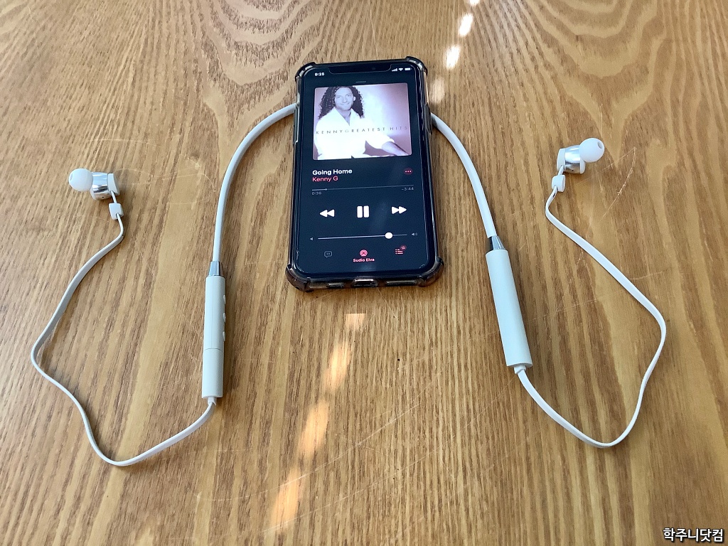 일반 블루투스 무선 이어폰들이 이어팁에만 지지해서 고정되는 방식이어서 불안한 부분이 있는데 저렇게 함으로 목 부분에서 지지해주면서 이어버드는 마치 거치형으로 귀에 꽂으면서 쓰니 훨씬 안정적으로 보인다는 것은 장점이라면 장점일 수도 있다는 생각이 든다.