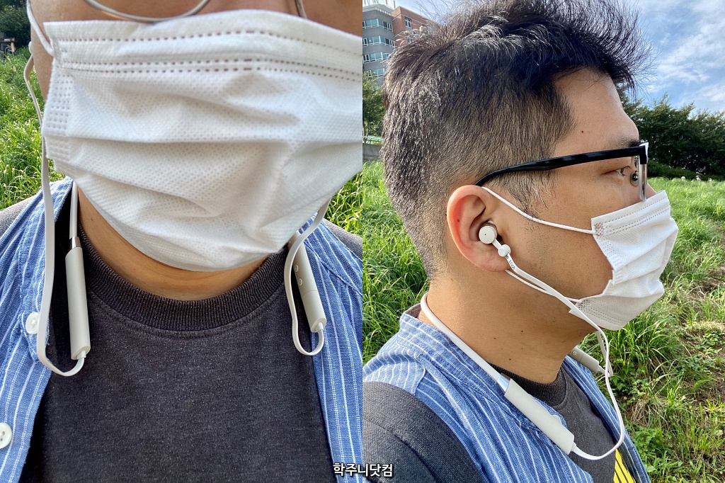 위의 사진은 야외에서 출퇴근 할 때 엘바를 쓰고 자전거로 출퇴근을 했는데 그 때의 모습이다. 위의 사진에서 보면 재질이 두꺼운 부분이 목을 감싸고 지지대 역할을 하고 있으며 제어 부분 윗쪽으로 이어버드 부분이 나오는 것을 볼 수 있다. 넥벤드는 아니지만 마치 넥벤드 스타일로 쓸 수 있다는 것이 꽤 괜찮은 듯 싶다.