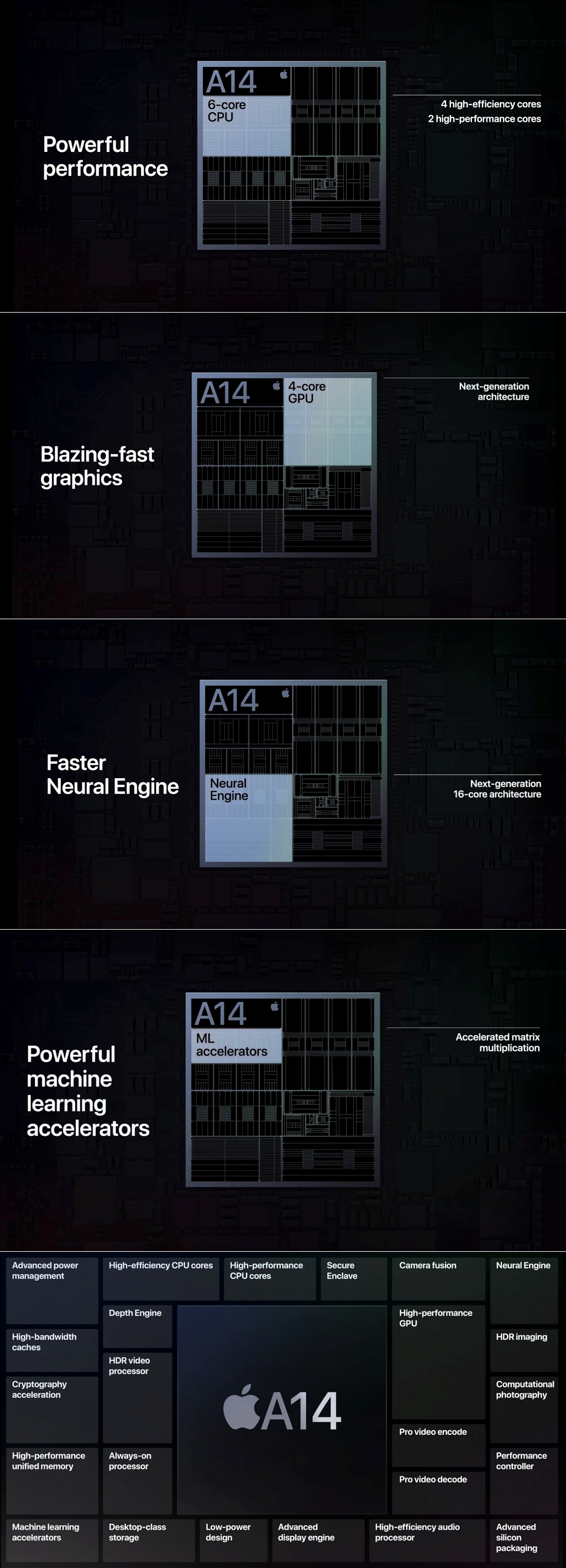 일단 CPU 코어 개수가 6개(4개의 일반 코어, 2개의 고성능 코어)로 늘어났으며 GPU 코어 역시 4개로 늘어났다. 뉴럴 엔진용 코어 역시 16개로 기존 대비 2배 증가했기 때문에 2배의 성능 향상이 있다고 한다. 머신러닝 성능도 대폭 향상이 되었다고 하는데 행렬 곱셈 연산 처리 전용 명령어 세트를 넣어서 기존보다 10배 더 빠른 결과를 낸다고 한다.