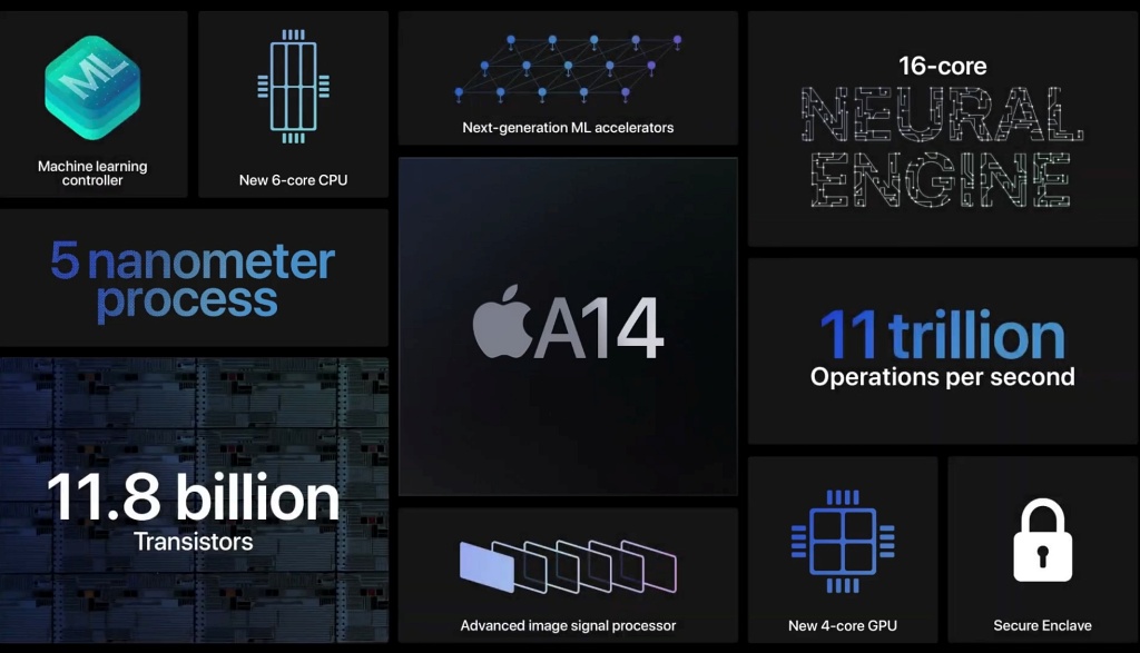 정리를 하면 A14 바이오닉 칩셋은 새로운 6개의 CPU, 4개의 GPU 코어를 탑재했고 16코어의 뉴럴 엔진이 들어갔으며 118억개의 트랜지스터를 넣었고 1초에 11조회의 연산을 할 수 있는 성능을 제공한다는 것이다.