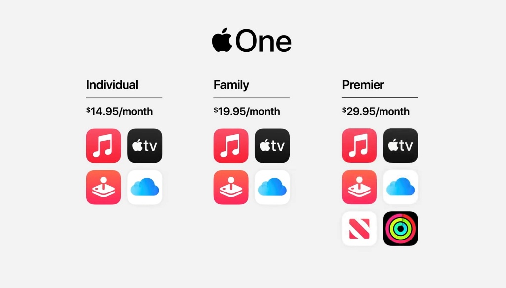 애플 원 서비스는 애플이 제공하는 구독형 서비스인 애플 뮤직, 애플TV+, 애플 아케이드, 아이클라우드, 애플뉴스+, 그리고 위에서 언급한 애플 피트니스+를 통합적으로 제공하는 서비스다.