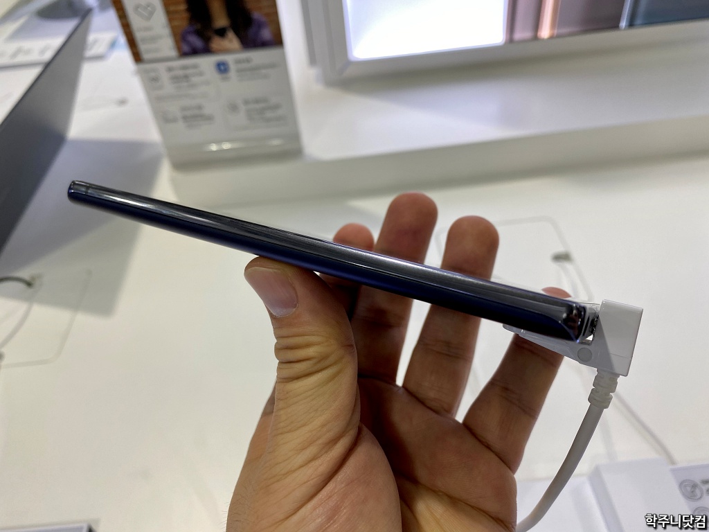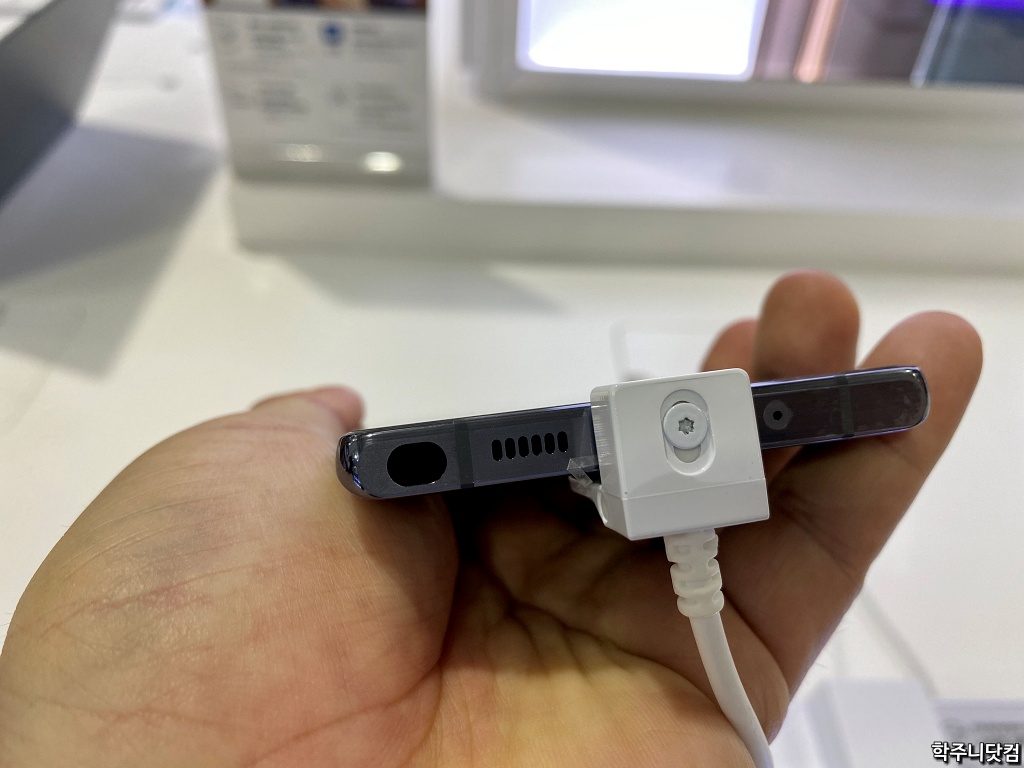 갤럭시노트20 밑면(전시품이라 S펜은 빠져있음) 갤럭시 노트 시리즈의 핵심은 역시나 S펜의 존재인데 전시품의 경우 S펜이 안끼워져 있고 별도로 옆에 전시해뒀다. 그래서 위의 사진처럼 S펜 구멍이 보인다(ㅋㅋ). 그리고 스피커 구멍도 보이고 USB-C 포트도 보이는데 Lock 장비때문에 USB-C 포트는 가려져 있다. 마이크 구멍도 보인다(작게.. ㅋㅋ).