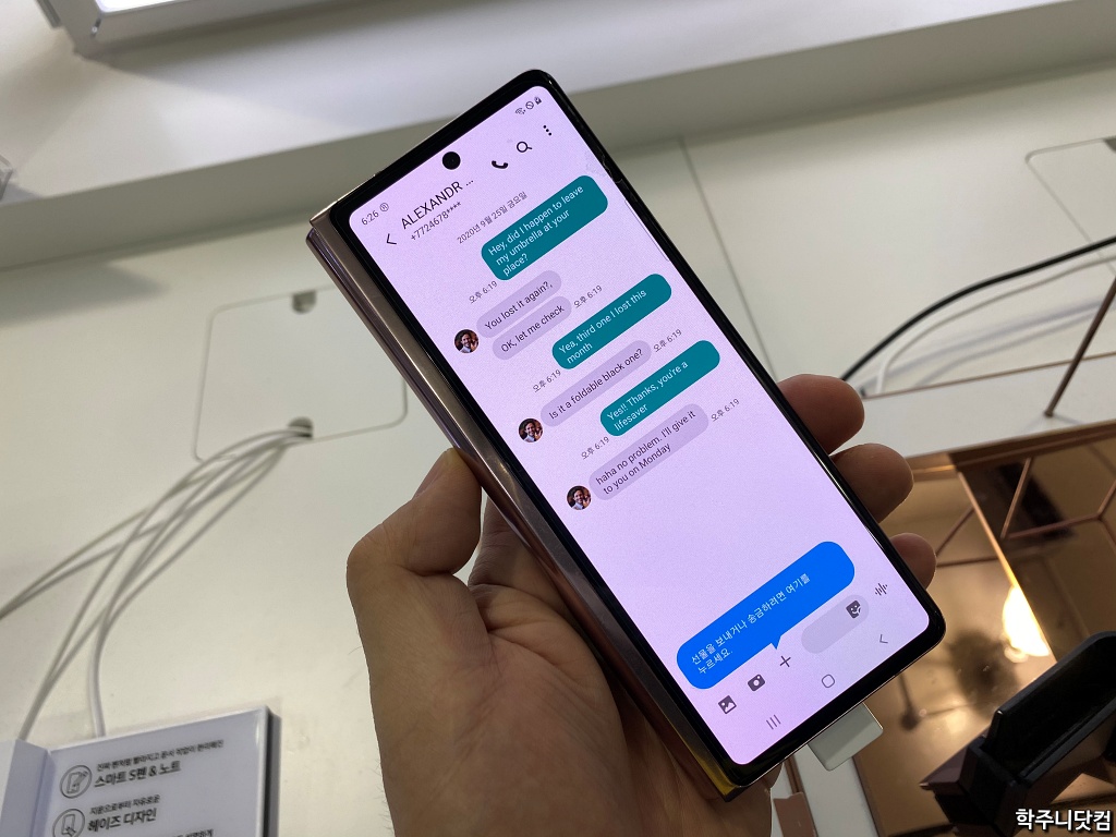 하지만 위의 사진을 보면 알 수 있듯 폴드2의 커버 디스플레이는 6.2인치의 풀사이즈 디스플레이고 전면을 다 쓰다보니 위와 같은 전화기 앱을 실행시키거나 밑에서 언급할 SMS를 실행할 때 그 크기와 시원함은 차원이 다르다. 폰트 크기도 더 커진 듯 싶고 아이콘 크기도 더 커진 것 같은 느낌이 들어서 사용성이 한결 더 좋아졌다는 생각이 든다.